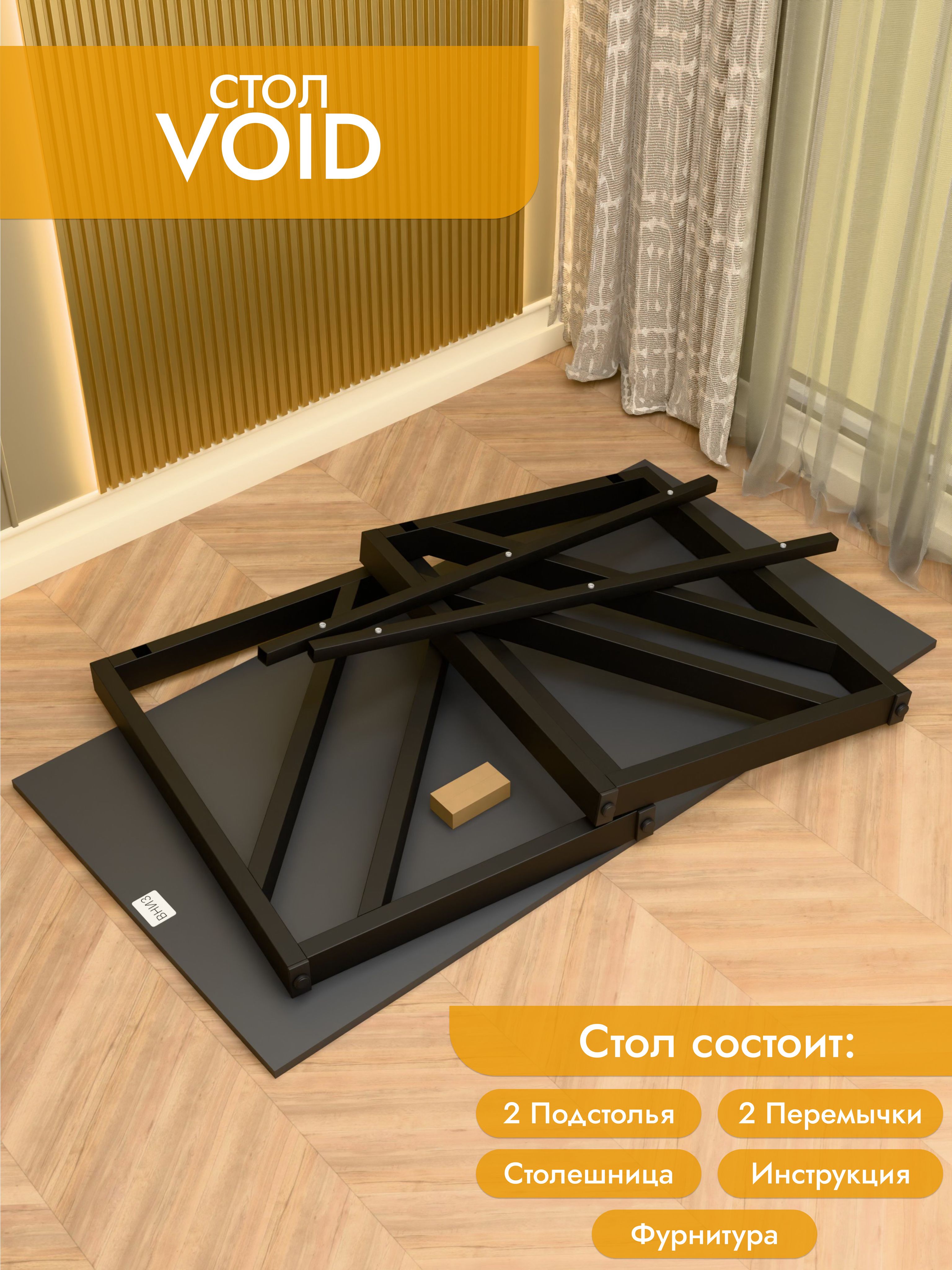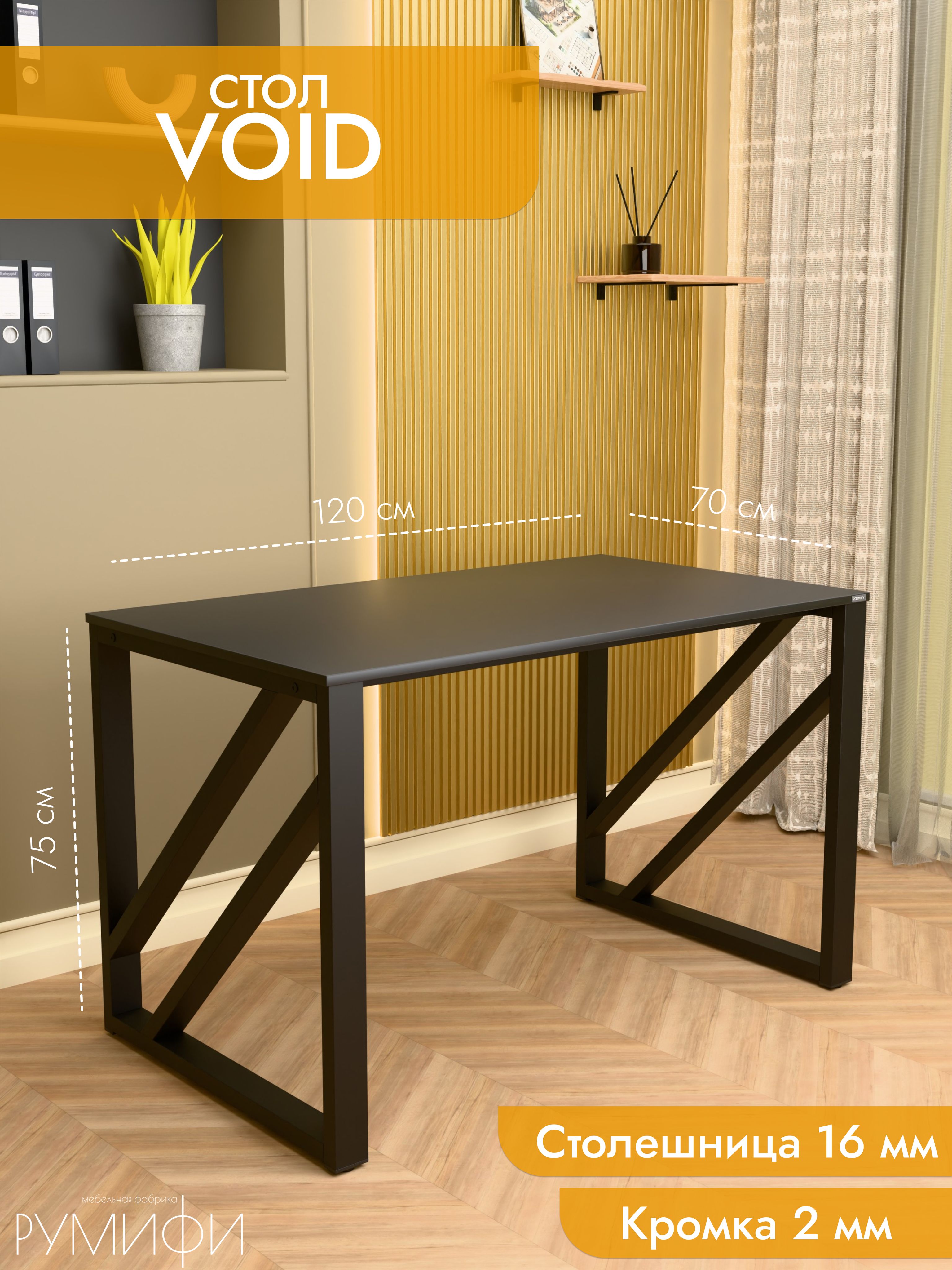 Модель Void отличается эффектным дизайном с диагональными перекрестными элементами на опорах. Благодаря такой конструкции стол выглядит технологично и современно, гармонично вписываясь как в офисное пространство, так и в домашний интерьер. Металлическое подстолье покрыто прочной порошковой краской, устойчивой к сколам и коррозии. Столешница из ЛДСП премиум с защитной кромкой гарантирует долговечность и удобство в эксплуатации. Размеры: ширина 120/135/155 см, глубина 60/70 см. Цвета: белая, антрацит, ателье светлый, дуб Сонома, дуб Табак. Цвет подстолья: белый или черный. Void — стильный акцент в интерьере с продуманной эргономикой.