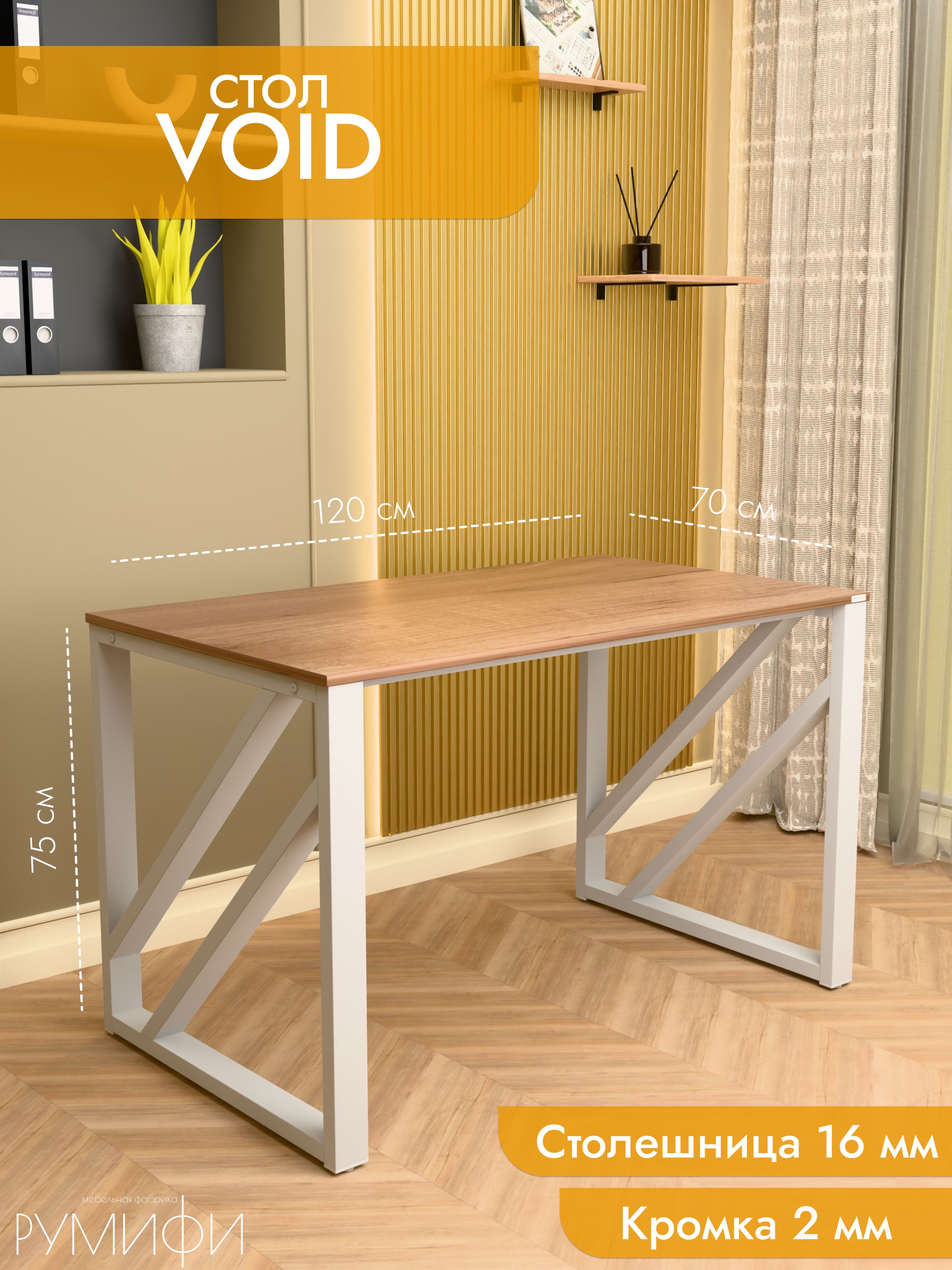 Модель Void отличается эффектным дизайном с диагональными перекрестными элементами на опорах. Благодаря такой конструкции стол выглядит технологично и современно, гармонично вписываясь как в офисное пространство, так и в домашний интерьер. Металлическое подстолье покрыто прочной порошковой краской, устойчивой к сколам и коррозии. Столешница из ЛДСП премиум с защитной кромкой гарантирует долговечность и удобство в эксплуатации. Размеры: ширина 120/135/155 см, глубина 60/70 см. Цвета: белая, антрацит, ателье светлый, дуб Сонома, дуб Табак. Цвет подстолья: белый или черный. Void — стильный акцент в интерьере с продуманной эргономикой.