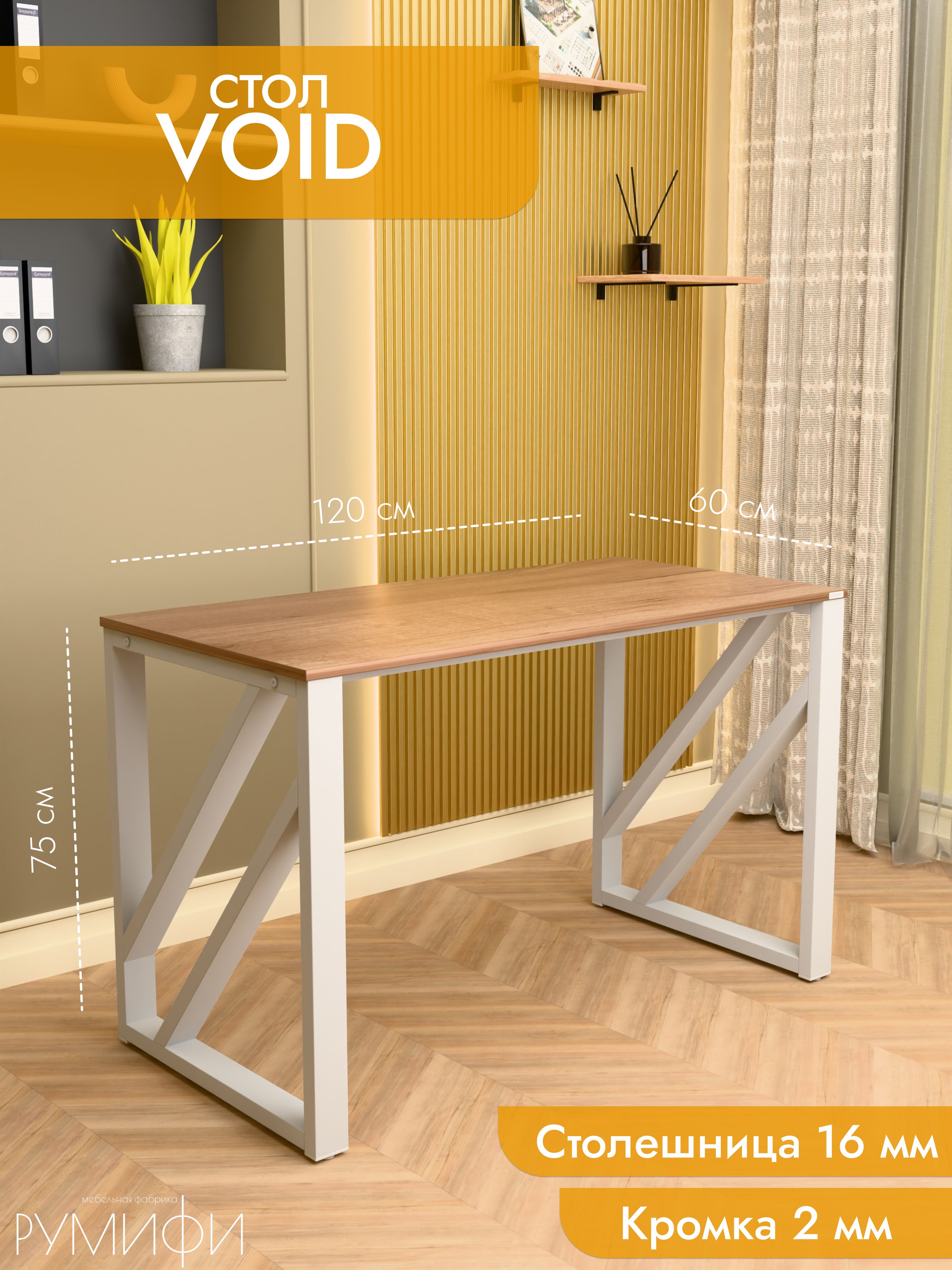 Модель Void отличается эффектным дизайном с диагональными перекрестными элементами на опорах. Благодаря такой конструкции стол выглядит технологично и современно, гармонично вписываясь как в офисное пространство, так и в домашний интерьер. Металлическое подстолье покрыто прочной порошковой краской, устойчивой к сколам и коррозии. Столешница из ЛДСП премиум с защитной кромкой гарантирует долговечность и удобство в эксплуатации. Размеры: ширина 120/135/155 см, глубина 60/70 см. Цвета: белая, антрацит, ателье светлый, дуб Сонома, дуб Табак. Цвет подстолья: белый или черный. Void — стильный акцент в интерьере с продуманной эргономикой.
