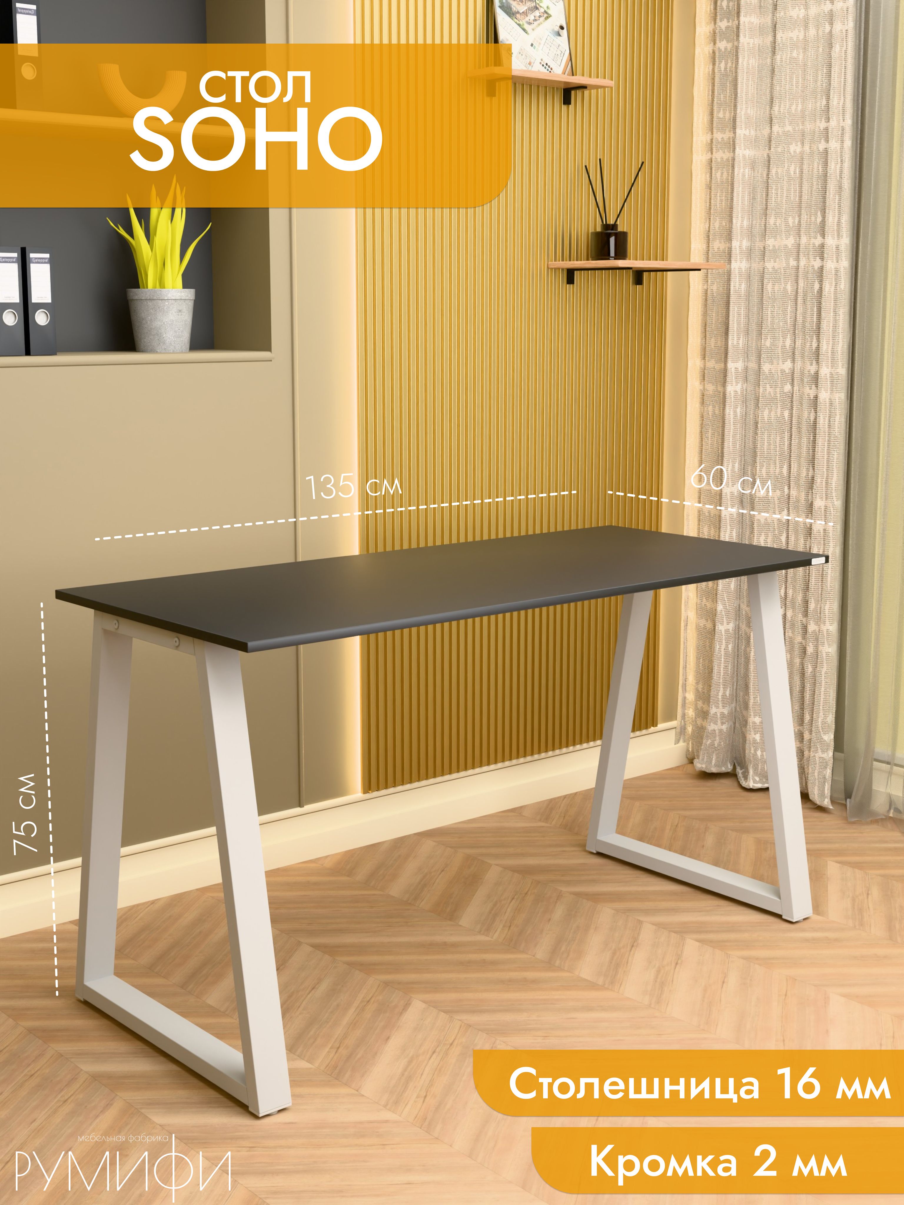 Стол Soho сочетает в себе легкость форм и современный минимализм. Скошенные опоры придают модели изящный вид, при этом не теряя в прочности. Металлическое основание устойчиво к нагрузкам и царапинам, а ЛДСП премиум с кромкой делает столешницу долговечной и удобной в уходе. Размеры: ширина 120/135/155 см, глубина 60/70 см. Цвета: белая, антрацит, ателье светлый, дуб Сонома, дуб Табак. Цвет подстолья: белый или черный. Soho — утонченное решение для стильного рабочего места.