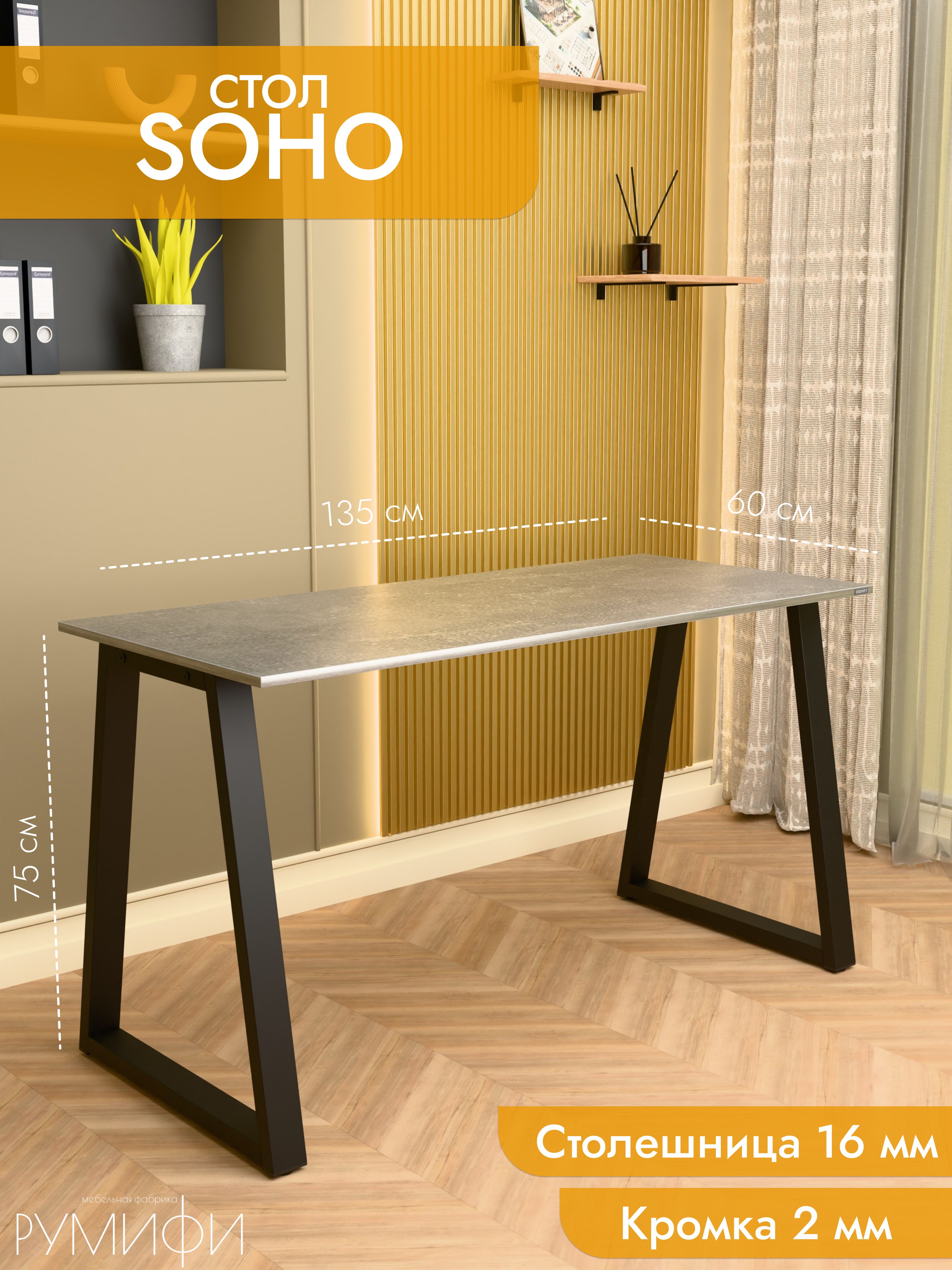 Стол Soho сочетает в себе легкость форм и современный минимализм. Скошенные опоры придают модели изящный вид, при этом не теряя в прочности. Металлическое основание устойчиво к нагрузкам и царапинам, а ЛДСП премиум с кромкой делает столешницу долговечной и удобной в уходе. Размеры: ширина 120/135/155 см, глубина 60/70 см. Цвета: белая, антрацит, ателье светлый, дуб Сонома, дуб Табак. Цвет подстолья: белый или черный. Soho — утонченное решение для стильного рабочего места.