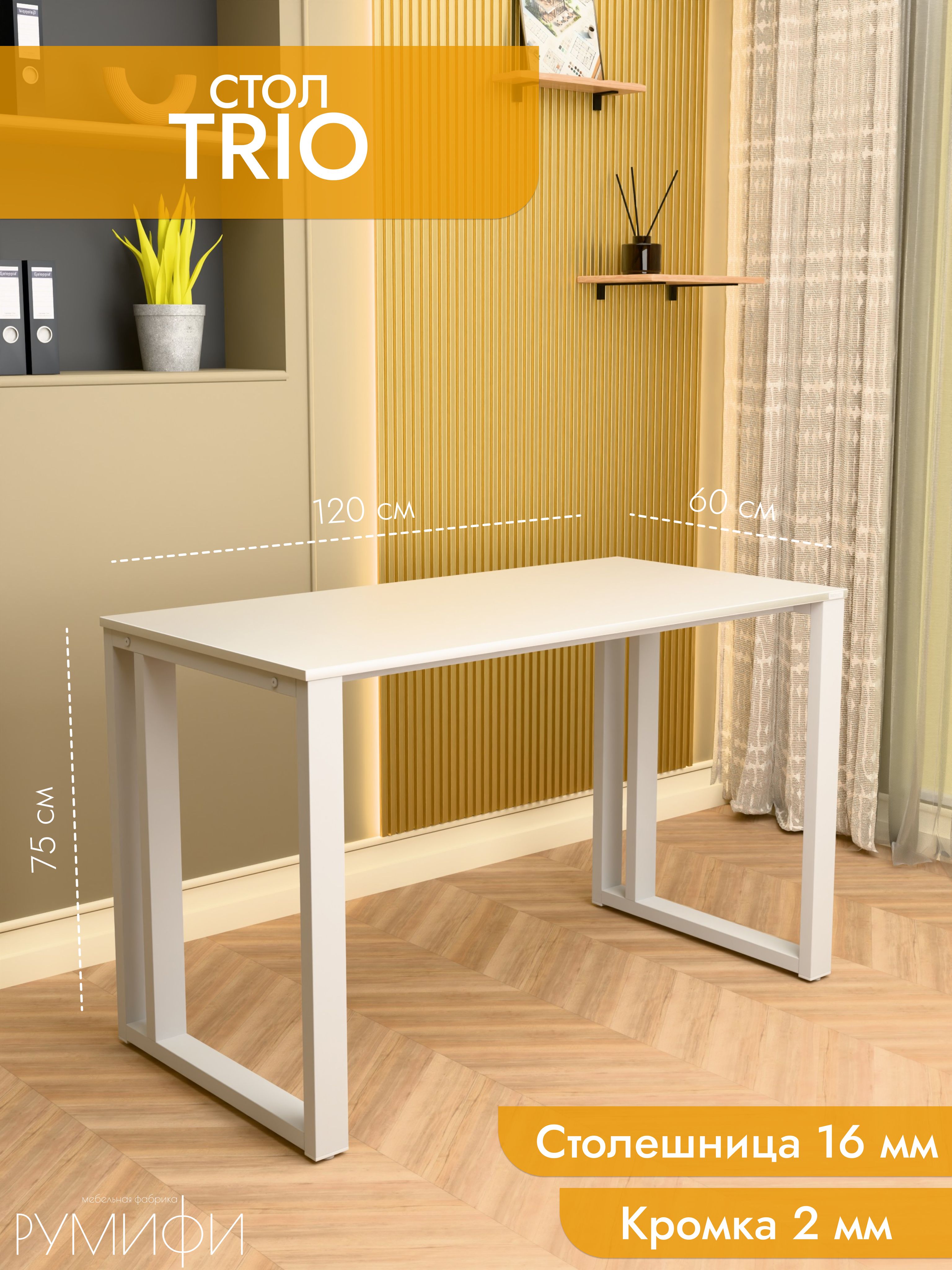 Практичный и современный стол Trio имеет прочное прямоугольное основание и дополнительную царгу для усиления конструкции. Это решение обеспечивает надежность даже при интенсивной эксплуатации. Столешница из ЛДСП премиум с кромкой устойчива к повседневным нагрузкам, а порошковое покрытие металла защищает от повреждений. Размеры: ширина 120/135/155 см, глубина 60/70 см. Цвета: белая, антрацит, ателье светлый, дуб Сонома, дуб Табак. Цвет подстолья: белый или черный. Trio — выбор для тех, кто ценит надежность и современный дизайн.