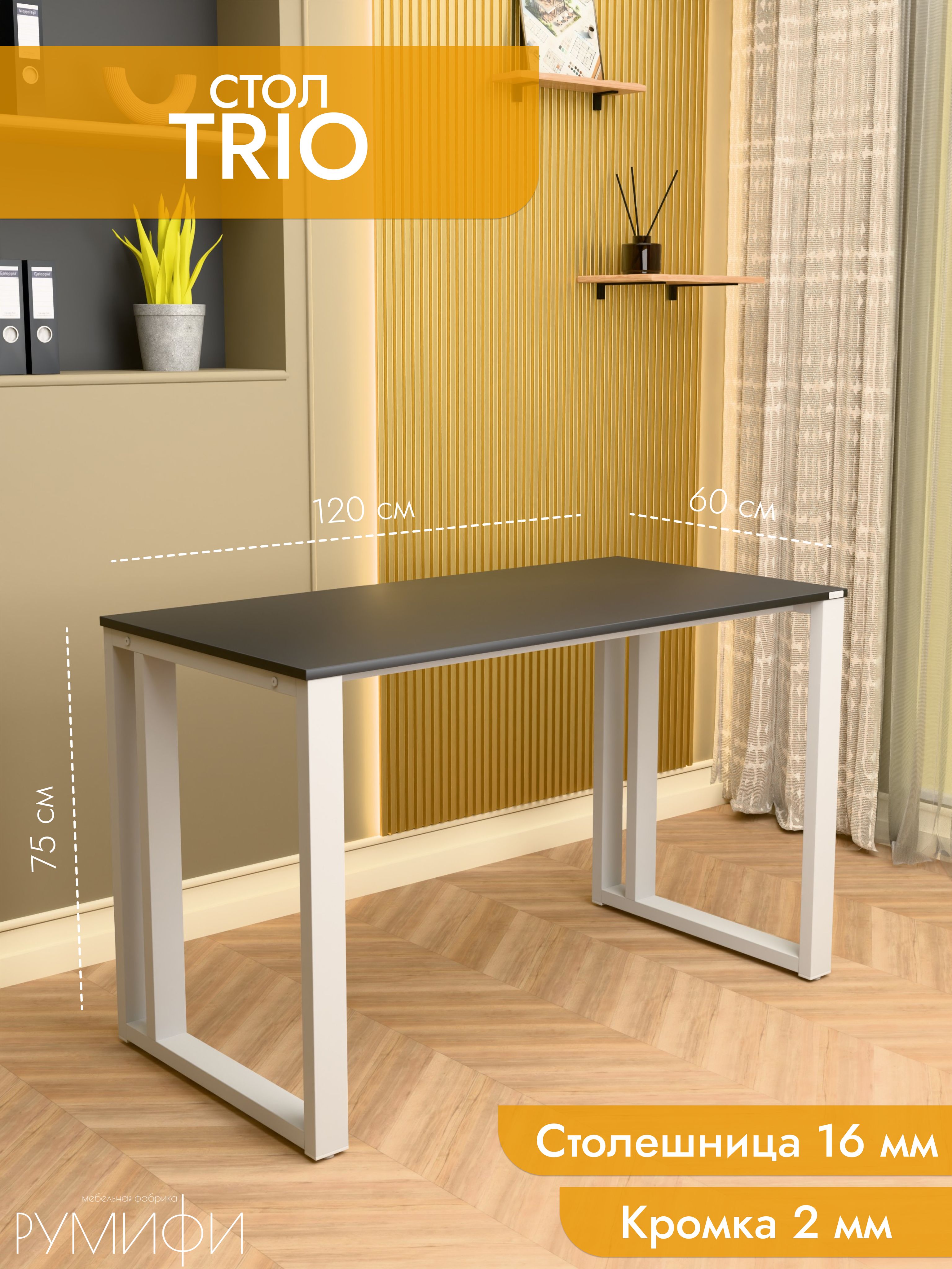 Практичный и современный стол Trio имеет прочное прямоугольное основание и дополнительную царгу для усиления конструкции. Это решение обеспечивает надежность даже при интенсивной эксплуатации. Столешница из ЛДСП премиум с кромкой устойчива к повседневным нагрузкам, а порошковое покрытие металла защищает от повреждений. Размеры: ширина 120/135/155 см, глубина 60/70 см. Цвета: белая, антрацит, ателье светлый, дуб Сонома, дуб Табак. Цвет подстолья: белый или черный. Trio — выбор для тех, кто ценит надежность и современный дизайн.