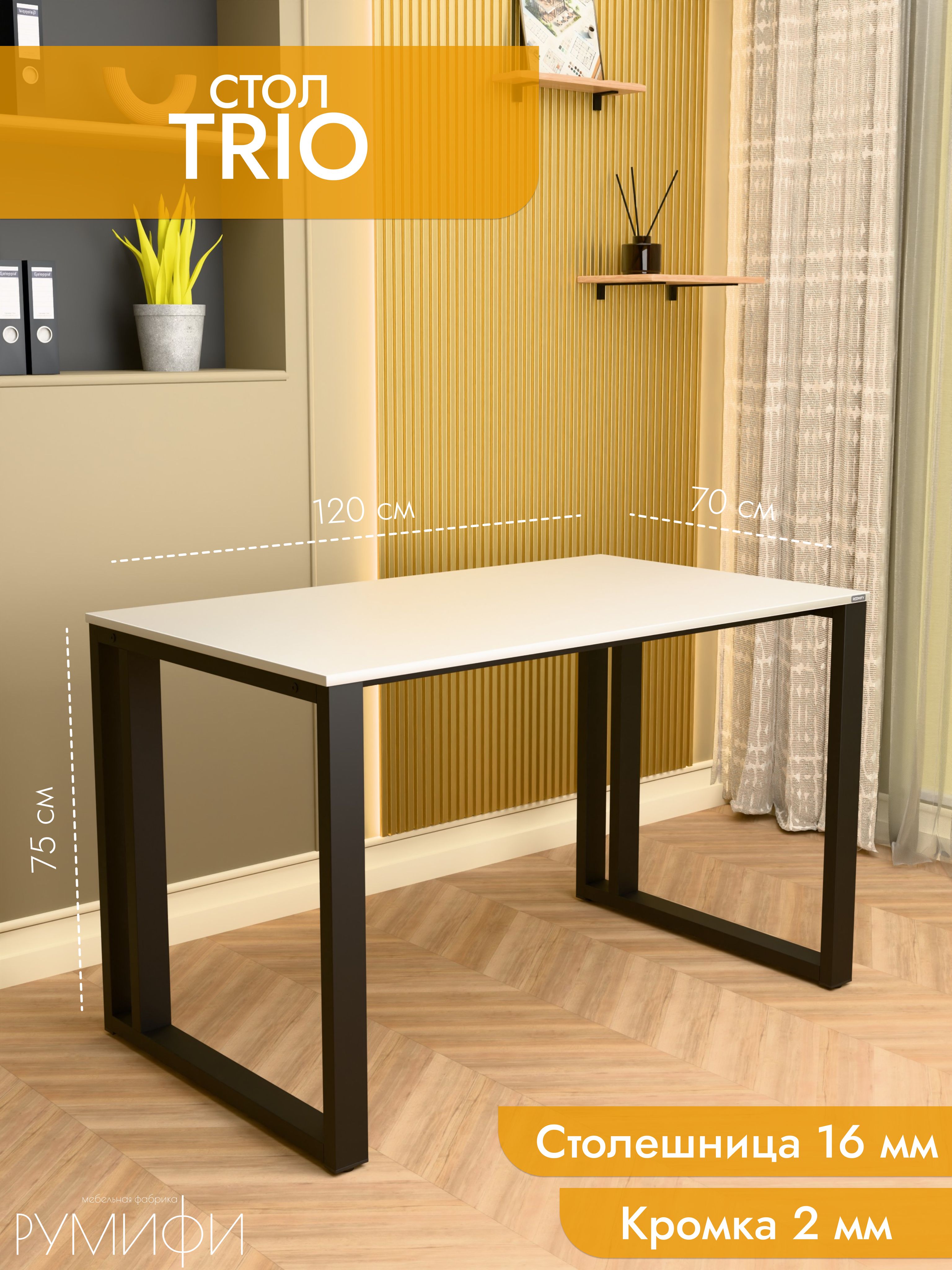 Практичный и современный стол Trio имеет прочное прямоугольное основание и дополнительную царгу для усиления конструкции. Это решение обеспечивает надежность даже при интенсивной эксплуатации. Столешница из ЛДСП премиум с кромкой устойчива к повседневным нагрузкам, а порошковое покрытие металла защищает от повреждений. Размеры: ширина 120/135/155 см, глубина 60/70 см. Цвета: белая, антрацит, ателье светлый, дуб Сонома, дуб Табак. Цвет подстолья: белый или черный. Trio — выбор для тех, кто ценит надежность и современный дизайн.