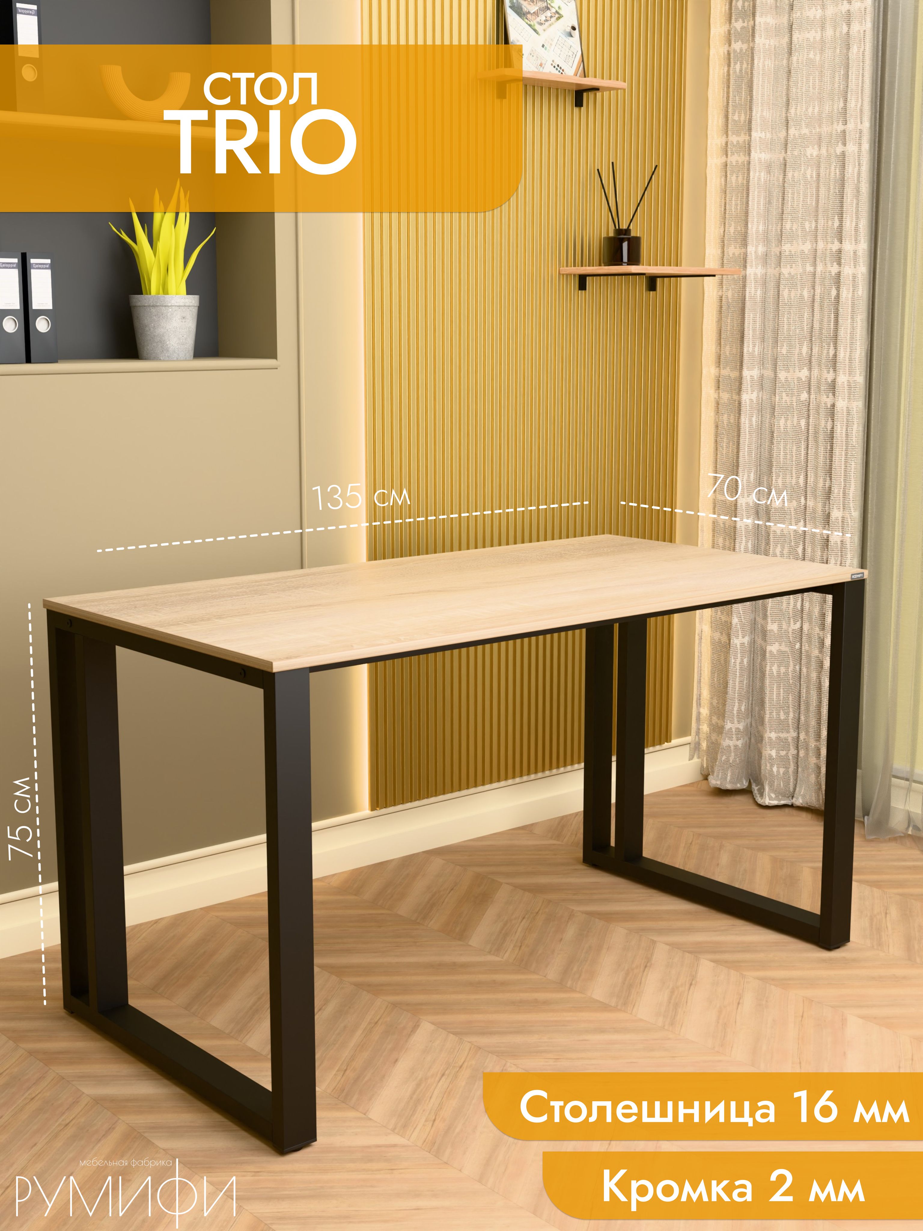 Практичный и современный стол Trio имеет прочное прямоугольное основание и дополнительную царгу для усиления конструкции. Это решение обеспечивает надежность даже при интенсивной эксплуатации. Столешница из ЛДСП премиум с кромкой устойчива к повседневным нагрузкам, а порошковое покрытие металла защищает от повреждений. Размеры: ширина 120/135/155 см, глубина 60/70 см. Цвета: белая, антрацит, ателье светлый, дуб Сонома, дуб Табак. Цвет подстолья: белый или черный. Trio — выбор для тех, кто ценит надежность и современный дизайн.