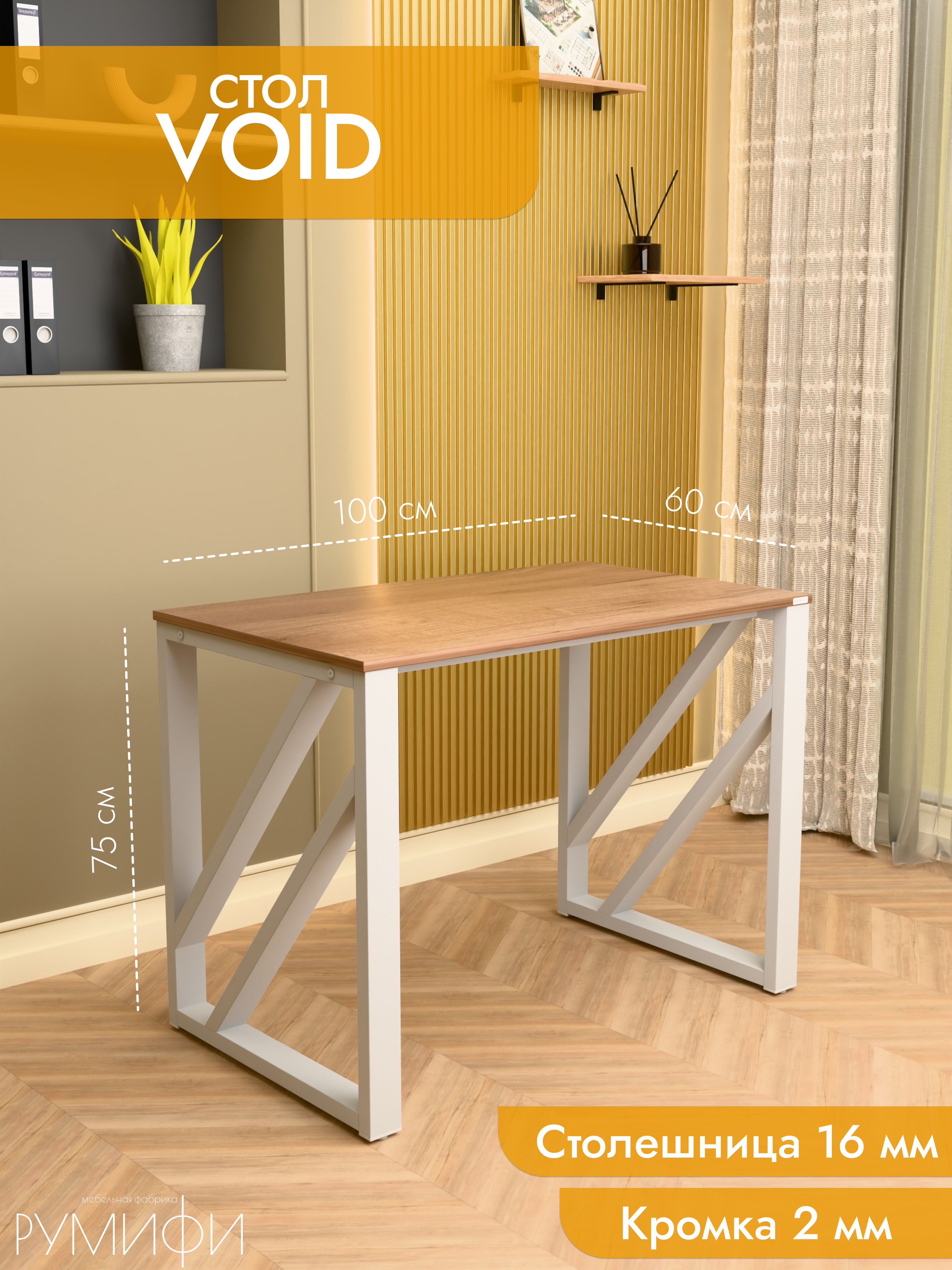 Модель Void отличается эффектным дизайном с диагональными перекрестными элементами на опорах. Благодаря такой конструкции стол выглядит технологично и современно, гармонично вписываясь как в офисное пространство, так и в домашний интерьер. Металлическое подстолье покрыто прочной порошковой краской, устойчивой к сколам и коррозии. Столешница из ЛДСП премиум с защитной кромкой гарантирует долговечность и удобство в эксплуатации. Размеры: ширина 100/135/155 см, глубина 60/70 см. Цвета: белая, антрацит, ателье светлый, дуб Сонома, дуб Табак. Цвет подстолья: белый или черный. Void — стильный акцент в интерьере с продуманной эргономикой.