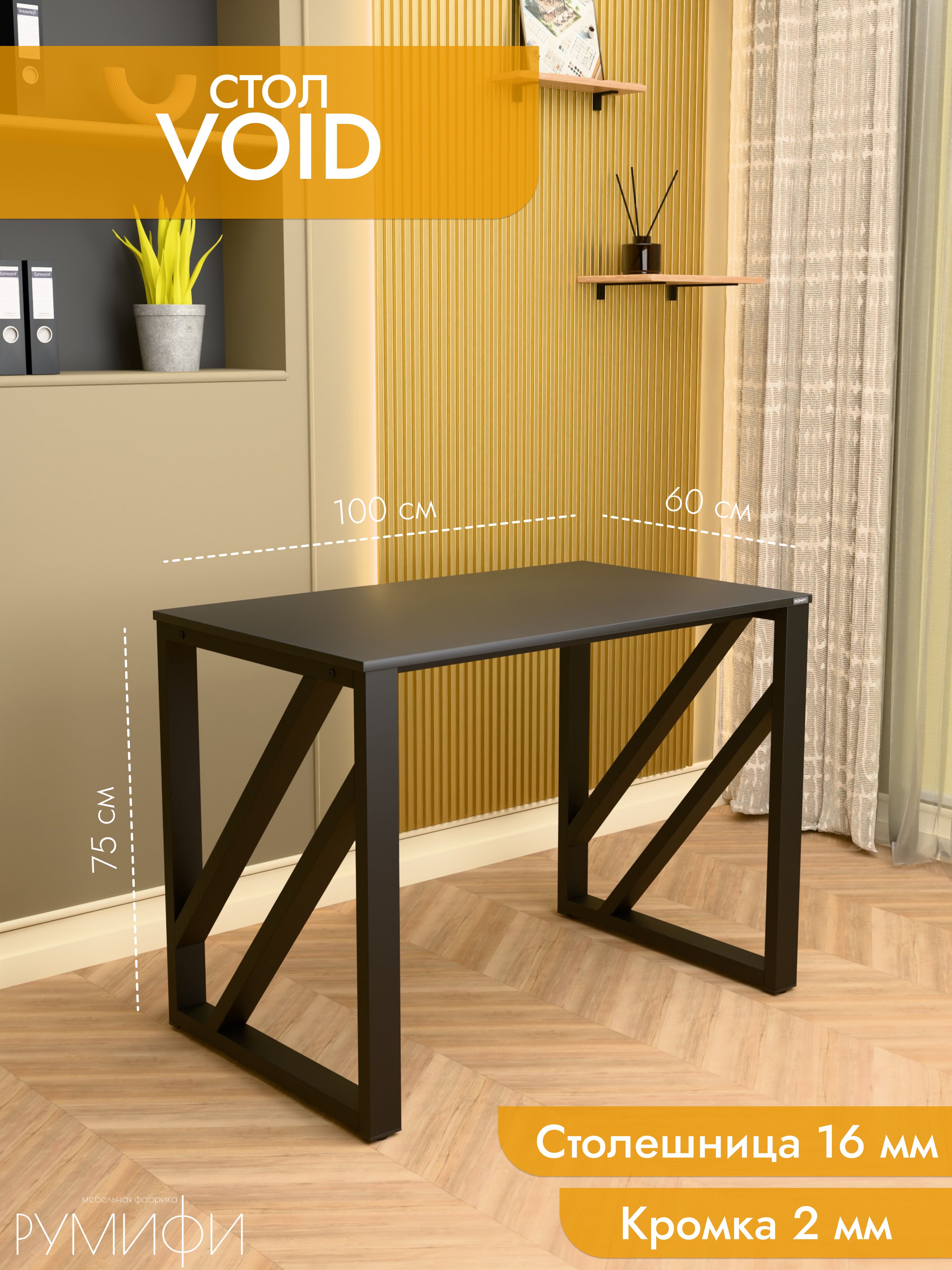 Модель Void отличается эффектным дизайном с диагональными перекрестными элементами на опорах. Благодаря такой конструкции стол выглядит технологично и современно, гармонично вписываясь как в офисное пространство, так и в домашний интерьер. Металлическое подстолье покрыто прочной порошковой краской, устойчивой к сколам и коррозии. Столешница из ЛДСП премиум с защитной кромкой гарантирует долговечность и удобство в эксплуатации. Размеры: ширина 100/135/155 см, глубина 60/70 см. Цвета: белая, антрацит, ателье светлый, дуб Сонома, дуб Табак. Цвет подстолья: белый или черный. Void — стильный акцент в интерьере с продуманной эргономикой.