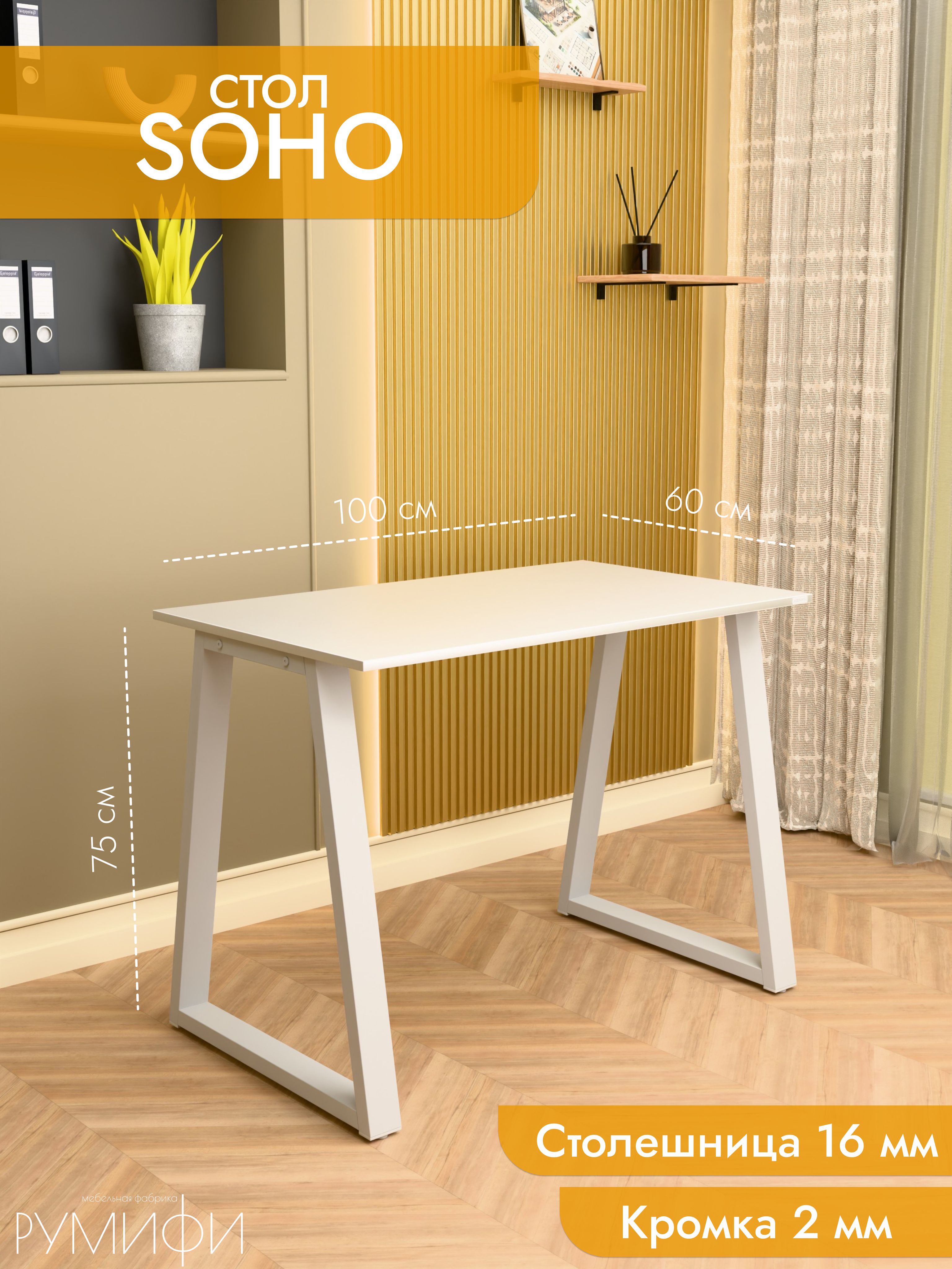 Офисный стол SOHO от Roomify – идеальное решение для современного пространства!<br/><br/>Элегантный письменный стол в стиле лофт и минимализма станет центральным элементом вашего рабочего места благодаря аккуратной прямоугольной форме и контрастному сочетанию матовой белоснежной столешницы из ЛДСП толщиной 16 мм и окрашенного металлического подстолья. Конструкция рассчитана на надежную эксплуатацию даже при высоких нагрузках, обеспечивает комфорт в работе и гармонично дополнит интерьер дома, офиса или учебного помещения.<br/><br/>Прочный каркас выдерживает вес до 150 кг, а комплектация включает все необходимое для быстрой сборки.<br/><br/>Выбирайте SOHO для создания организованного и стильного уголка, где каждый день зарядится энергией эффективности!