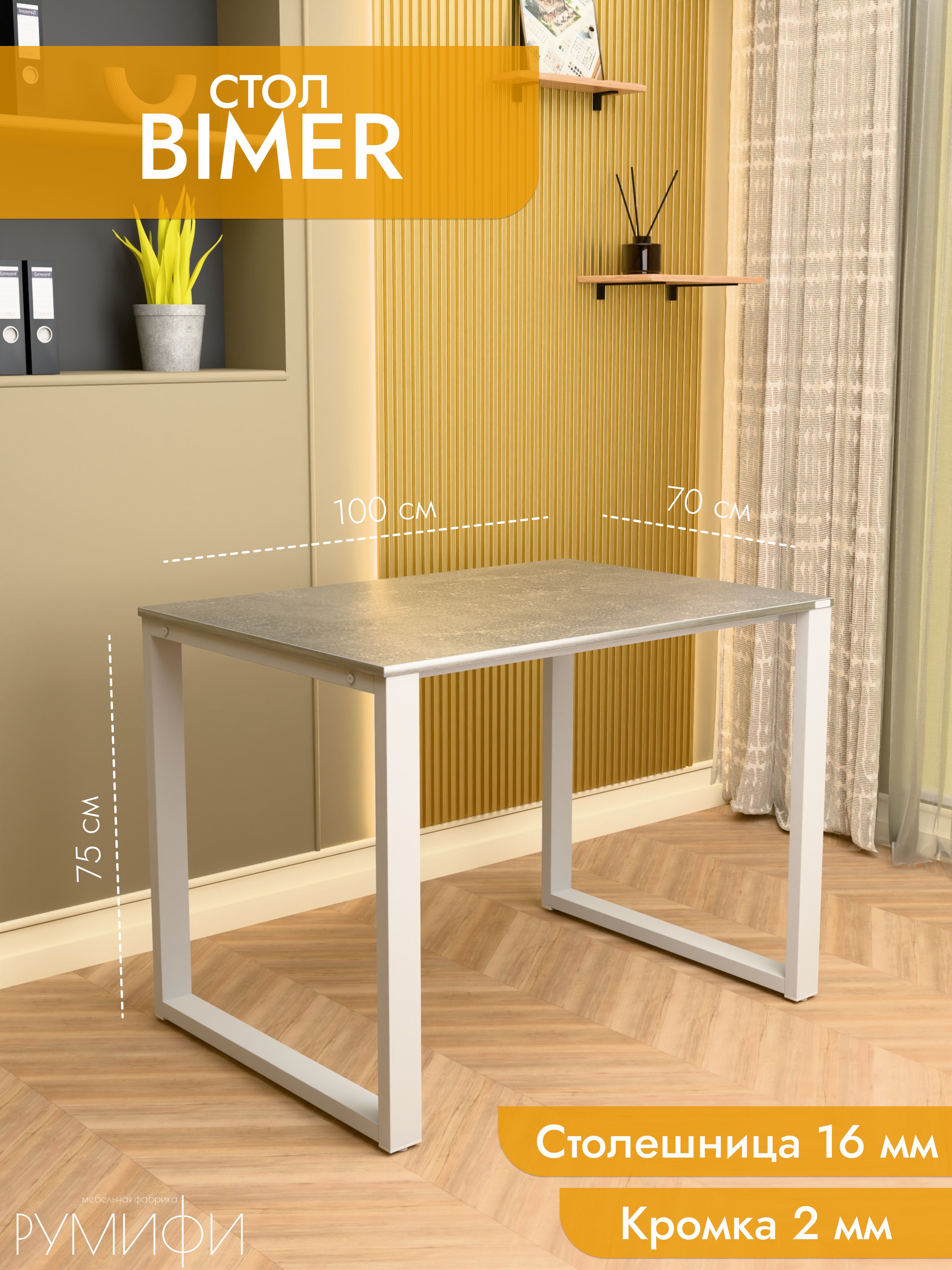 Офисный стол BIMER от Roomify сочетает современный дизайн и надежность. Компактные размеры 100x70 см и высота 75 см обеспечивают комфорт при работе за компьютером или выполнении домашних задач. Столешница из прочной ЛДСП толщиной 16 мм выдерживает до 150 кг, а металлическое подстолье с окрашенным покрытием добавляет изделию долговечности.<br/><br/>Эргономичная конструкция в стиле лофт и минимализма гармонично впишется в интерьер офиса, учебного кабинета или рабочего уголка дома.<br/><br/>Элегантный белый цвет дополняет натуральная фактура материала, подчеркивая стильность. Гарантия 12 месяцев обеспечивает уверенность в качестве сборки и эксплуатации.<br/><br/>Простота установки и универсальное назначение делают модель подходящей для различных помещений. Товар поставляется в разобранном виде, что облегчает транспортировку и хранение до монтажа.