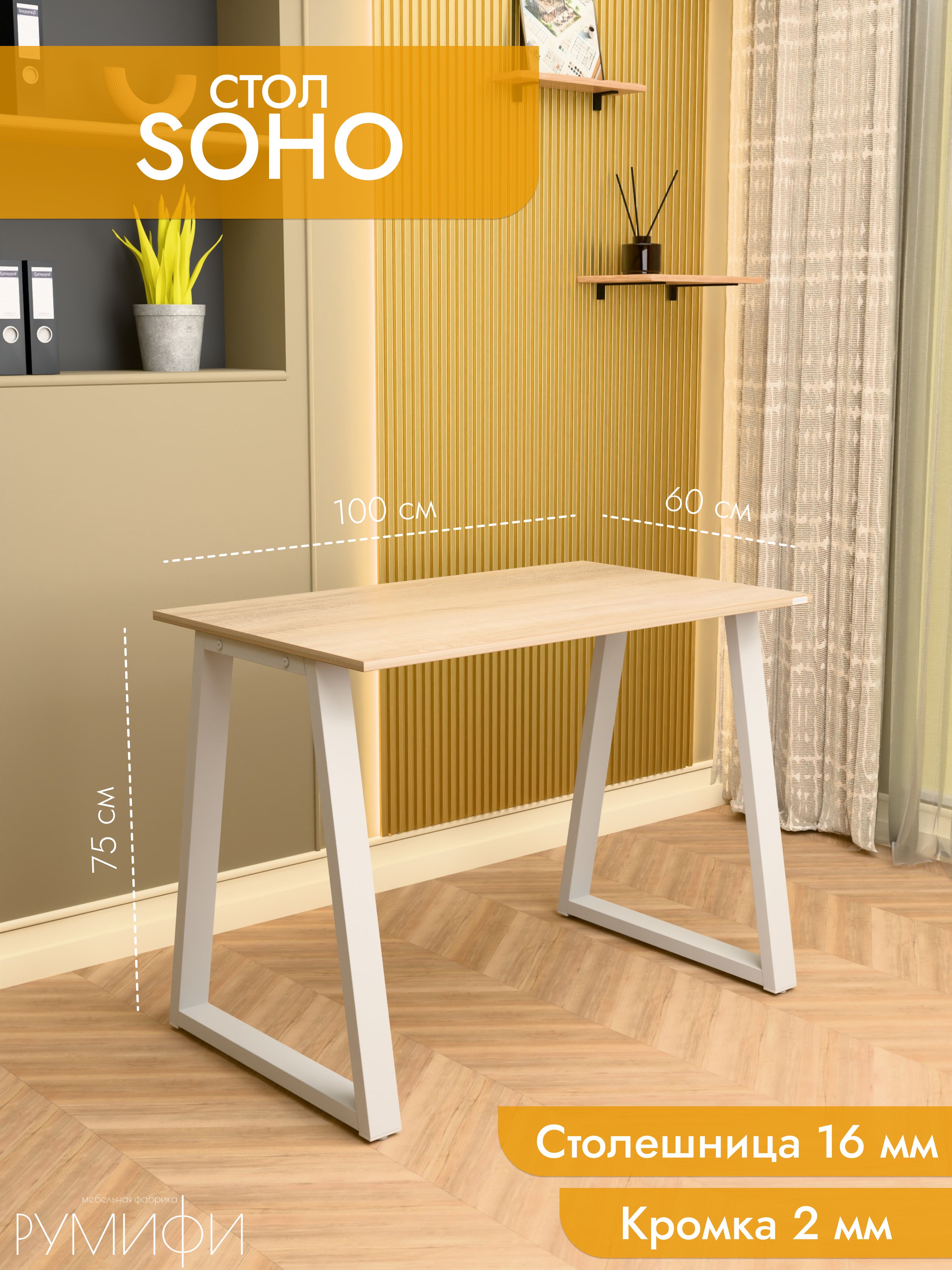 Офисный стол SOHO от Roomify – идеальное сочетание функциональности и элегантного дизайна.<br/><br/>Прочный ЛДСП обеспечивает устойчивость к повседневной эксплуатации, а легкие металлические опоры создают эффект воздушности. Современные акценты в духе лофта и минимализма гармонично впишутся в любой интерьер, будь то рабочее место, школьная зона или уголок отдыха.<br/><br/>Универсальная конструкция позволяет равномерно распределить нагрузку до средних объемов, гарантируя безопасность и комфорт.<br/><br/>Таблица легко адаптирована под различные задачи благодаря продуманному исполнению. Эргономическая высота и компактные формы обеспечивают удобство в использовании.<br/><br/>Цветовые решения в сочетании натуральных фактур подчеркивают индустриальные черты, делая модель актуальной для модернизированного пространства. Гарантия качества 12 месяцев подтверждает уверенность производителя в надежности своей продукции.