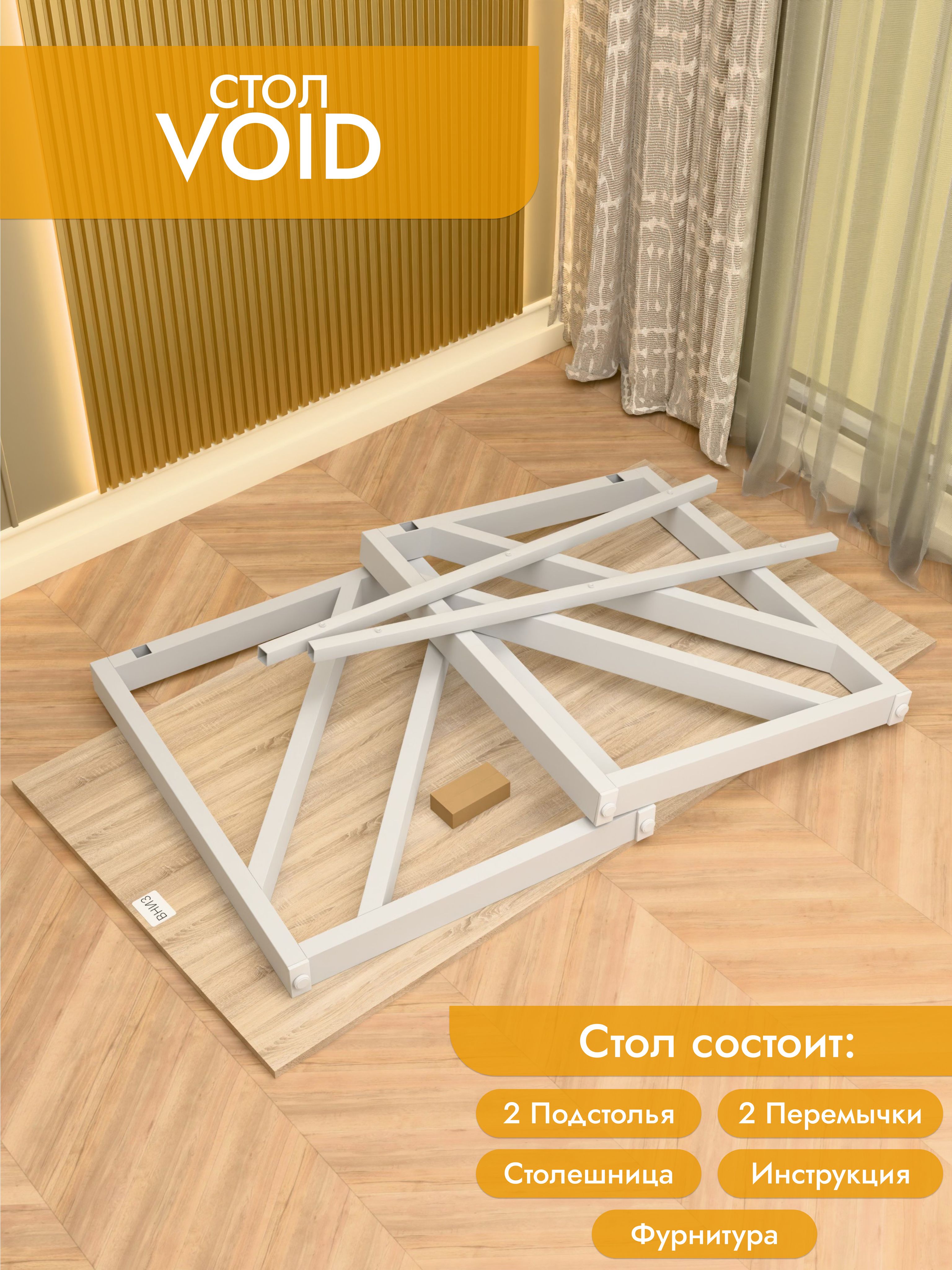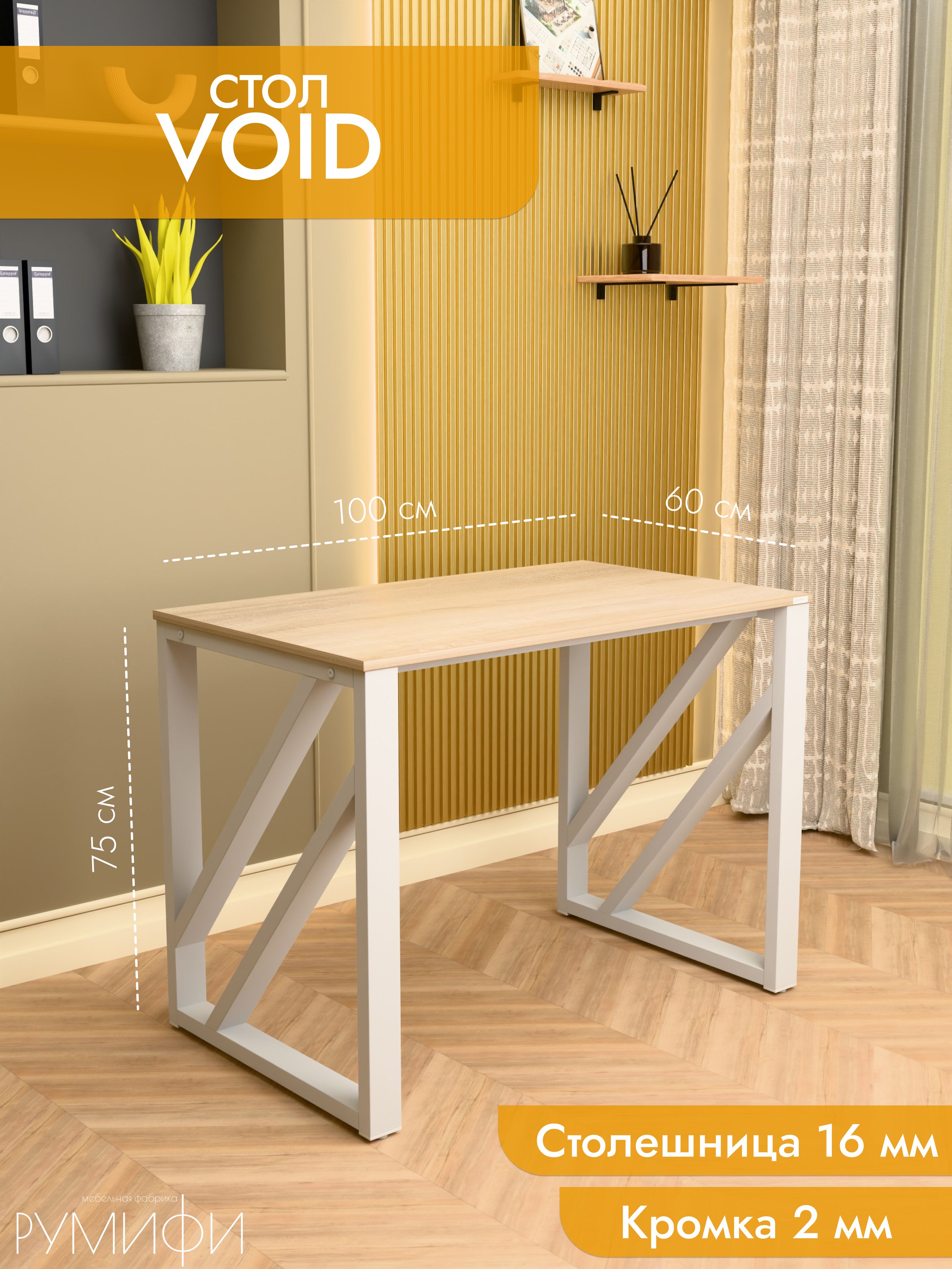 Модель Void отличается эффектным дизайном с диагональными перекрестными элементами на опорах. Благодаря такой конструкции стол выглядит технологично и современно, гармонично вписываясь как в офисное пространство, так и в домашний интерьер. Металлическое подстолье покрыто прочной порошковой краской, устойчивой к сколам и коррозии. Столешница из ЛДСП премиум с защитной кромкой гарантирует долговечность и удобство в эксплуатации. Размеры: ширина 100/135/155 см, глубина 60/70 см. Цвета: белая, антрацит, ателье светлый, дуб Сонома, дуб Табак. Цвет подстолья: белый или черный. Void — стильный акцент в интерьере с продуманной эргономикой.