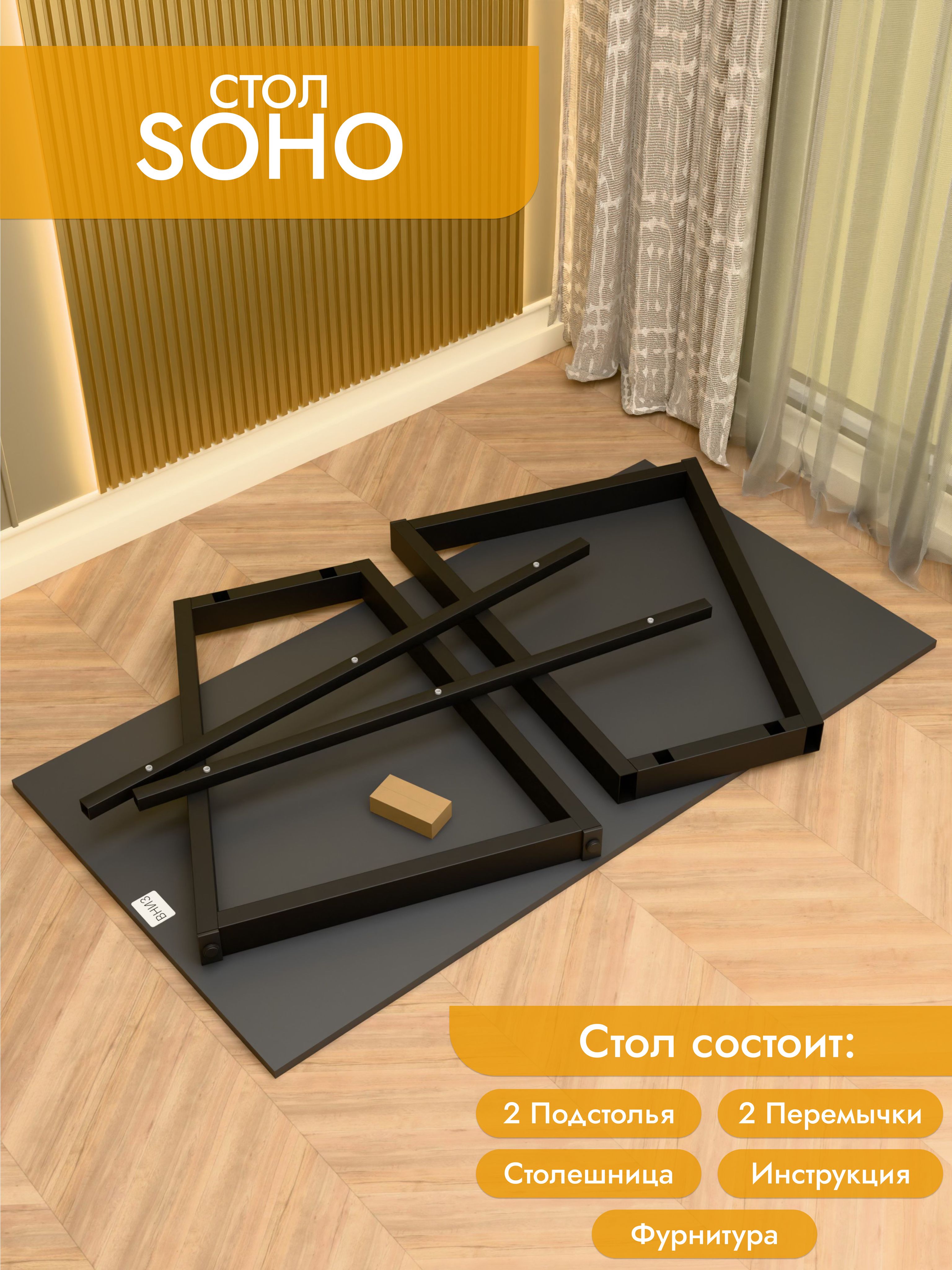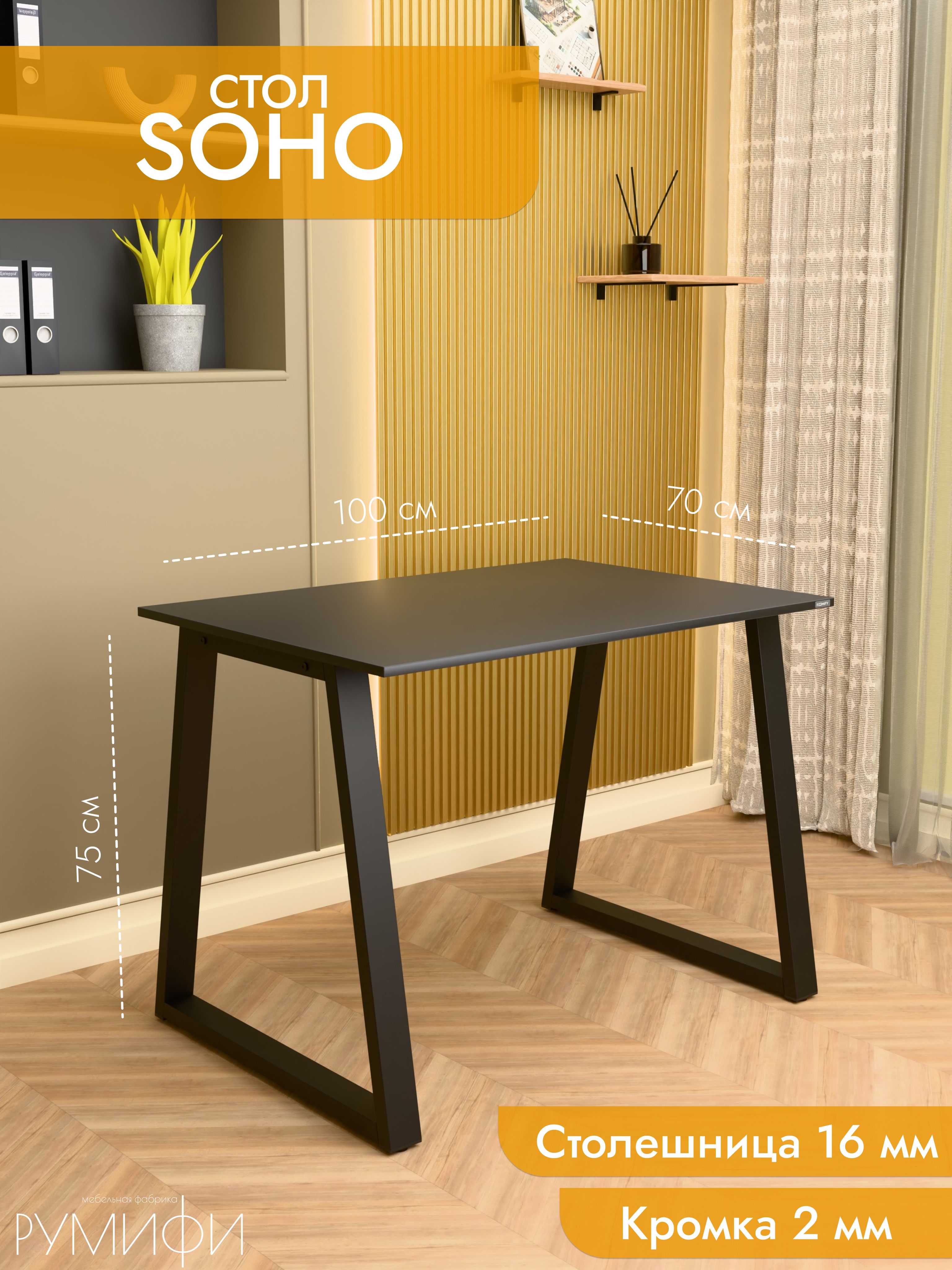 Офисный стол SOHO от Roomify — это сочетание современного дизайна и надежной конструкции. Прочный металлический каркас с окрашенным покрытием и столешница из ЛДСП толщиной 16 мм обеспечивают устойчивость к нагрузкам до 30 кг. Минималистичный черный муаровый цвет и формы в стиле лофт делают его гармоничным элементом интерьера как в домашнем кабинете, так и в офисе.<br/><br/>Просторная поверхность (100x70 см) удобна для работы с компьютером, документов или художественных задач.<br/><br/>Универсальная высота 75 см позволяет использовать стол в различных помещениях. Компактная форма и комплектация в разобранном виде облегчают транспортировку и самостоятельную сборку.<br/><br/>Гарантия подтверждает качество исполнения. Этот стол станет практичным решением для тех, кто ценит функциональность и стиль в каждой детали.