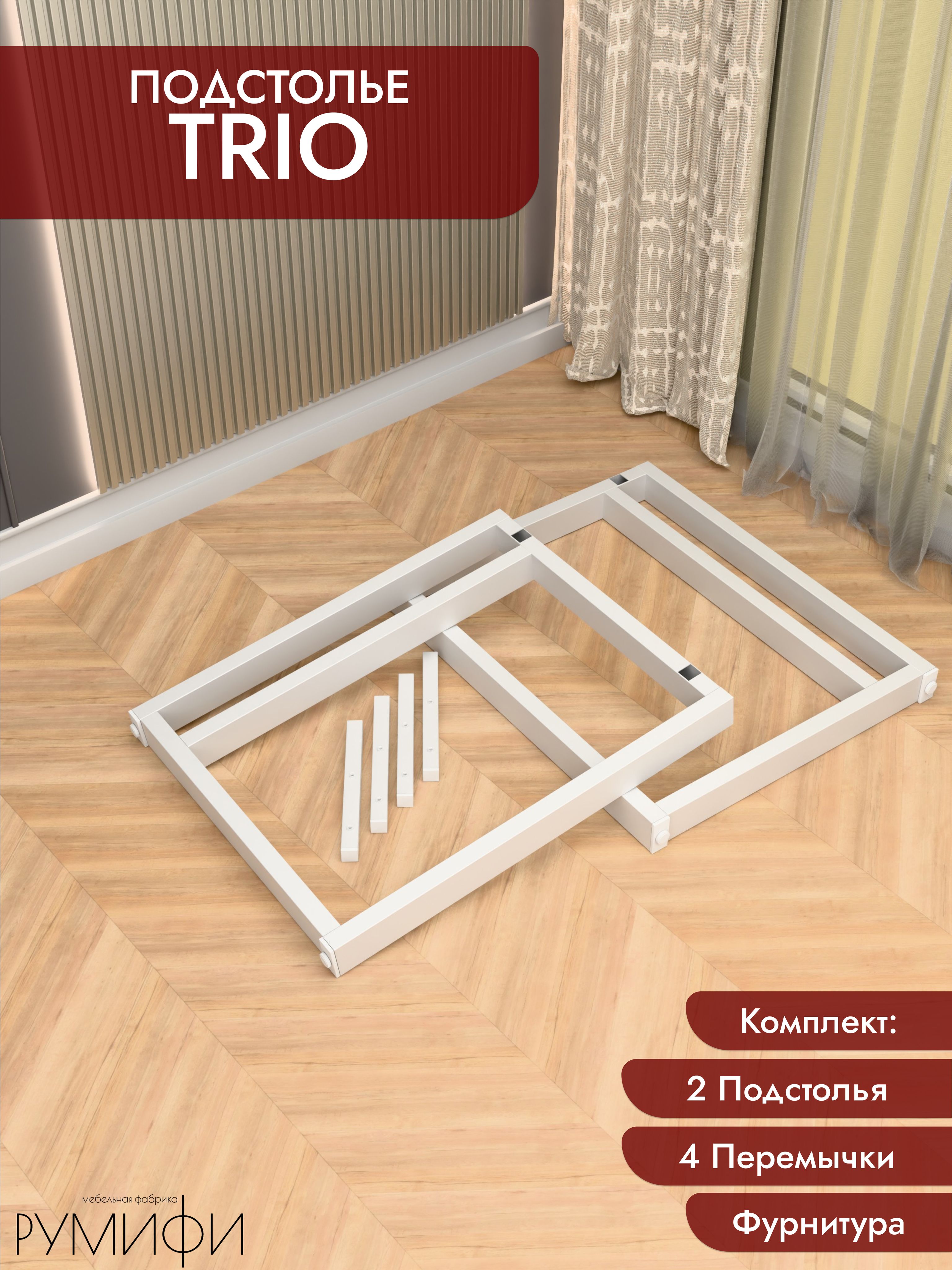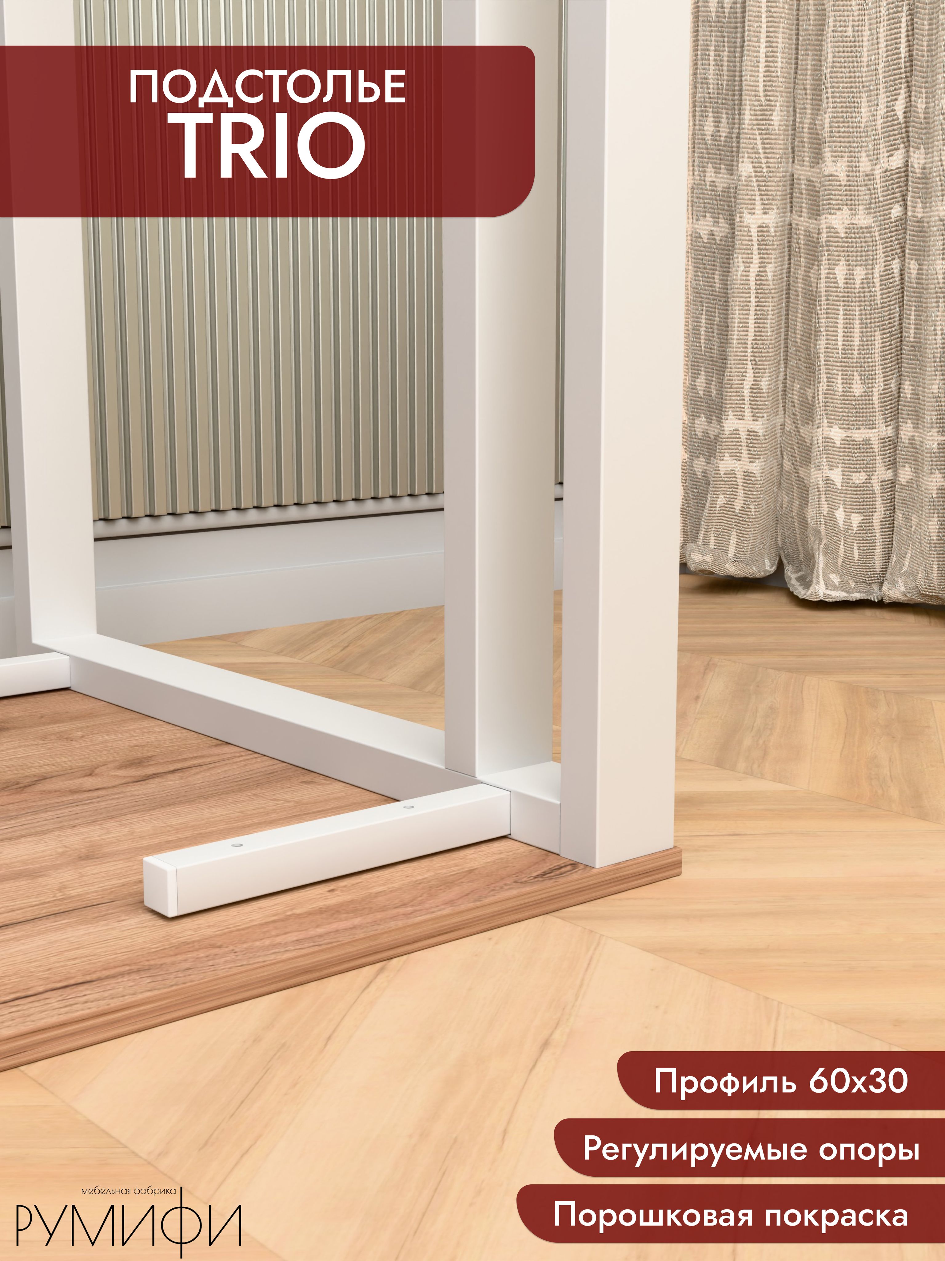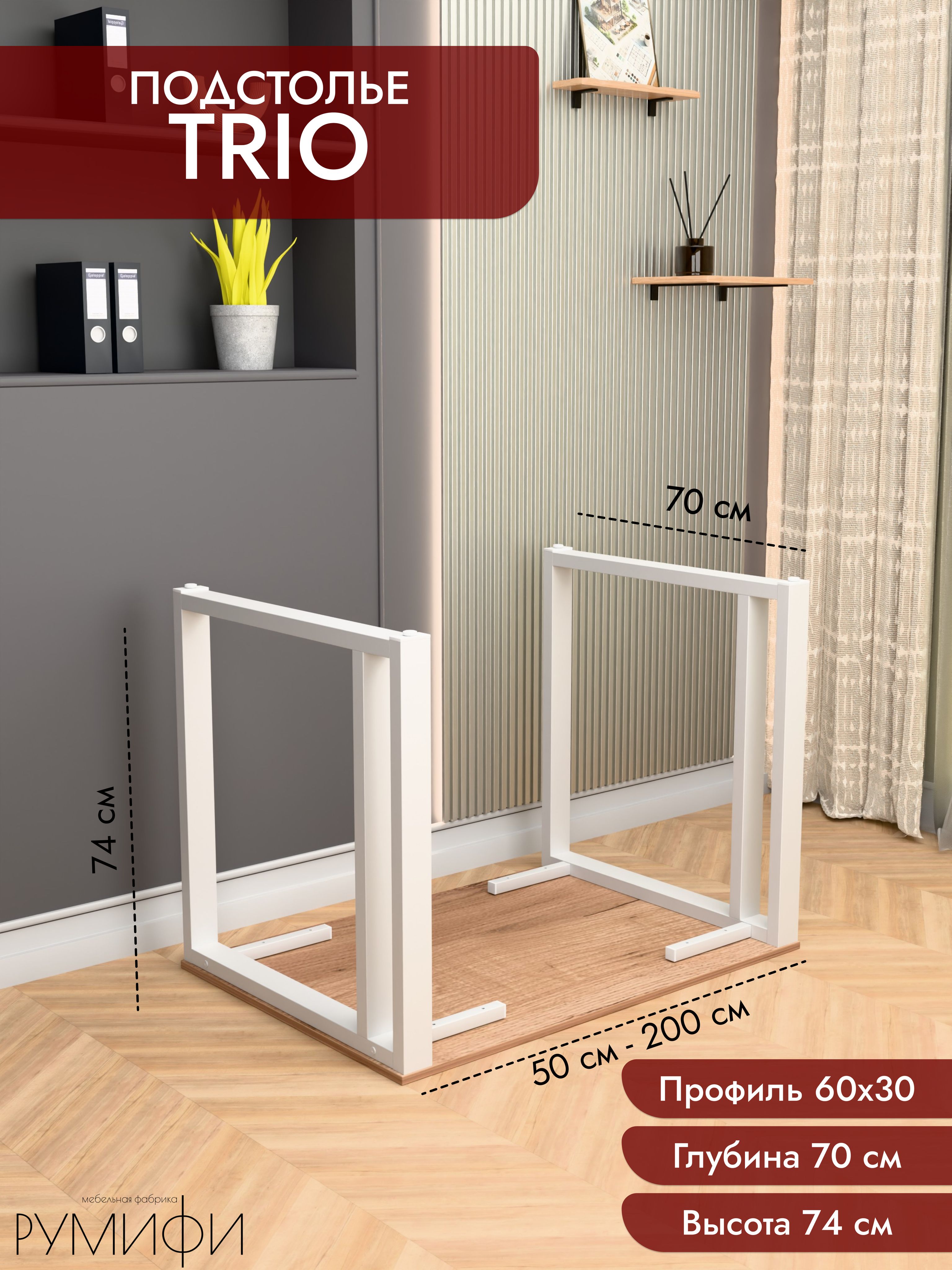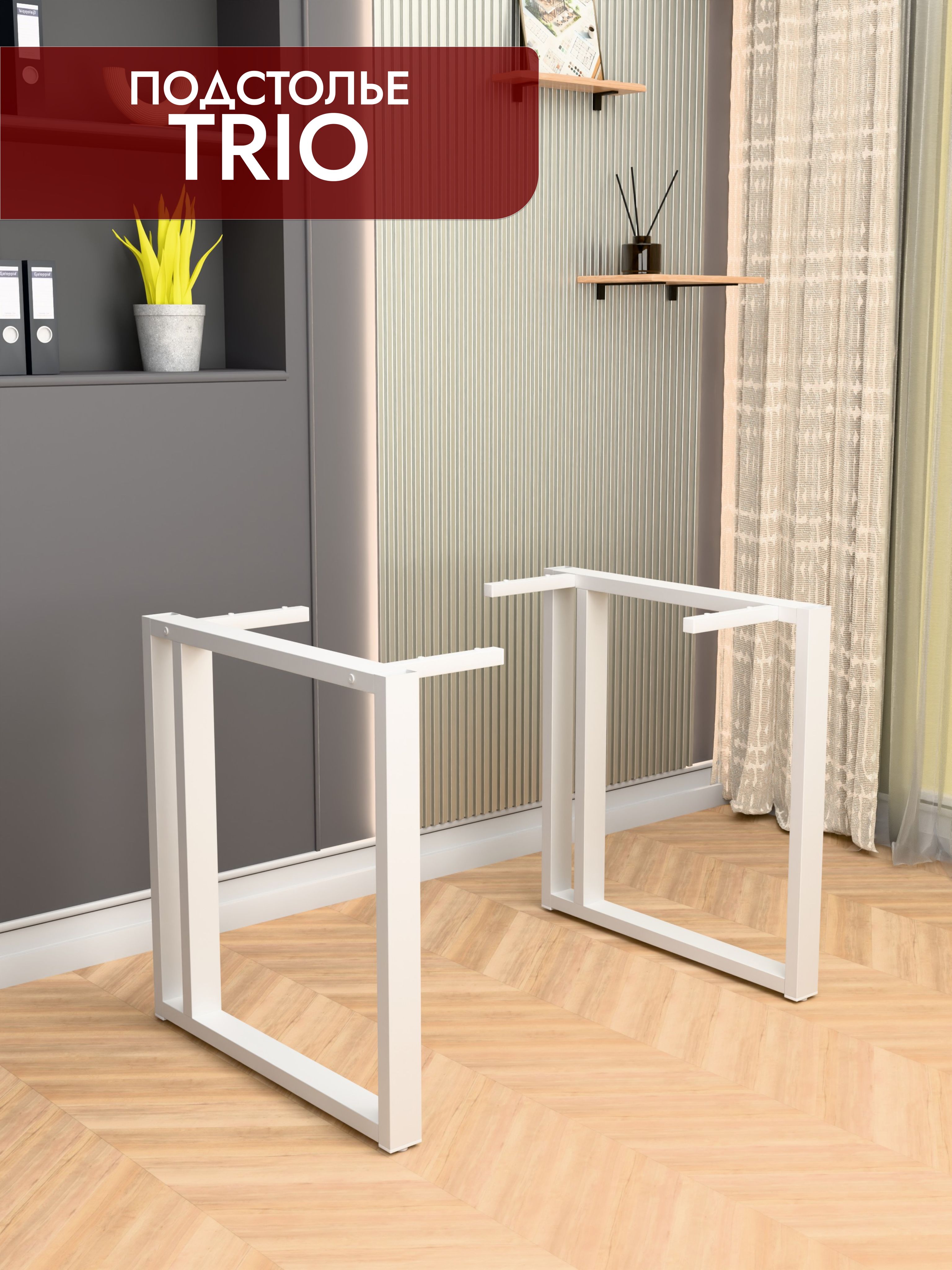 Подстолье TRIO — стальной каркас под столешницу с акцентом на устойчивость и чистые линии. Профиль 60×30 мм, отделка — порошковое покрытие (белый / чёрный муар). Фиксированная высота каркаса 74 см, глубина 60 или 70 см. Регулируемые опоры, ход 1,5 см. Сборно-разборная конструкция, от производителя.