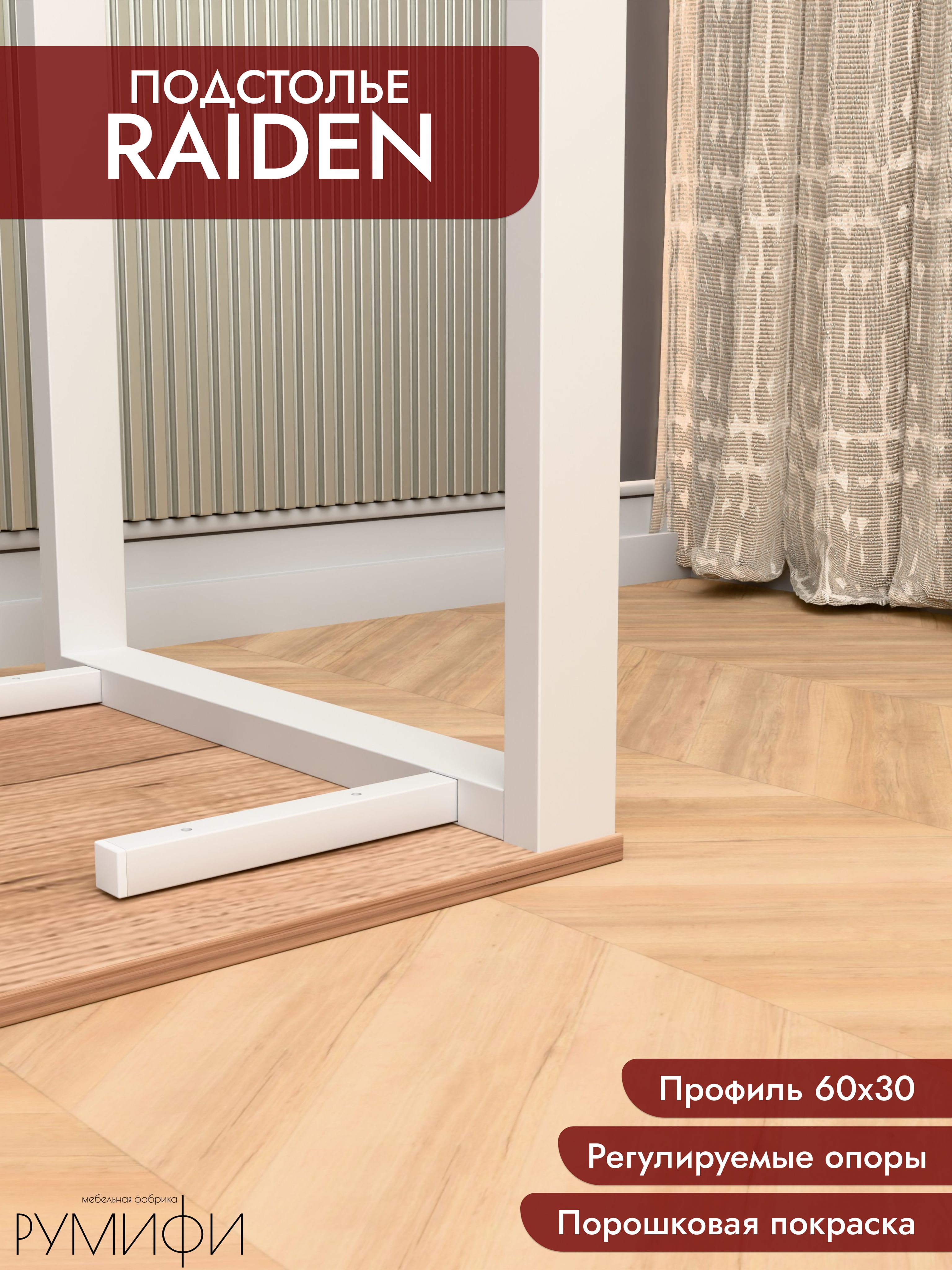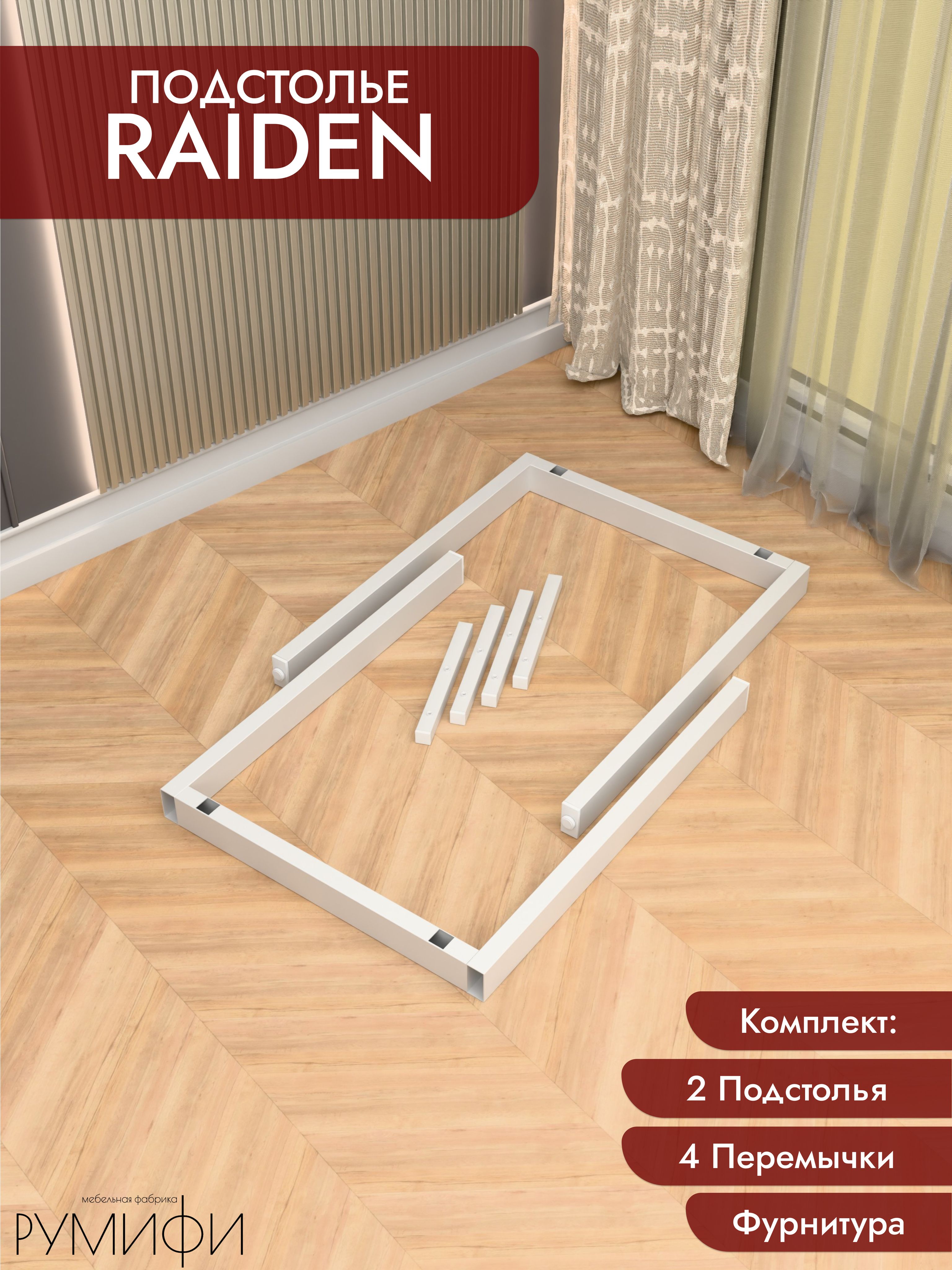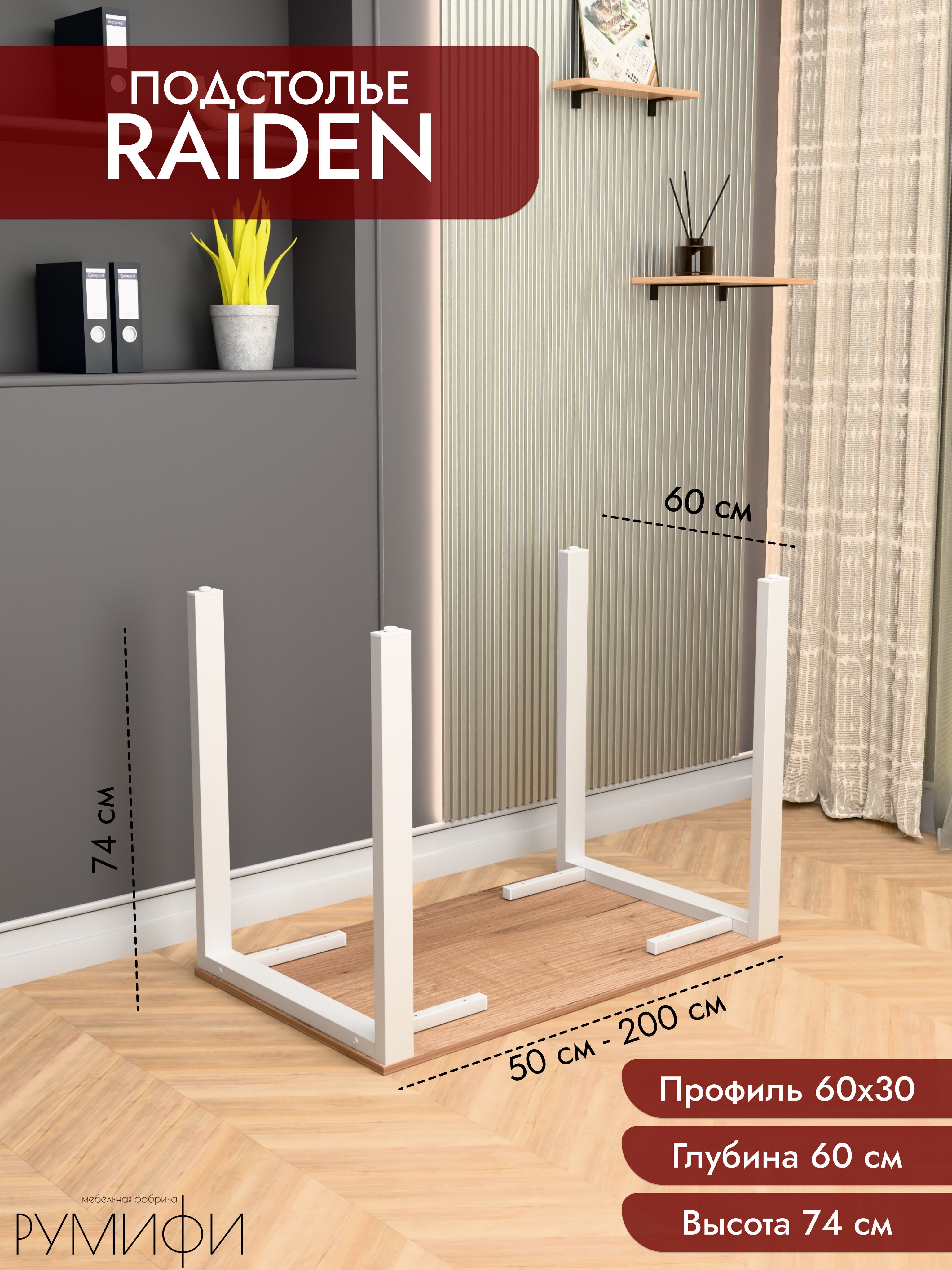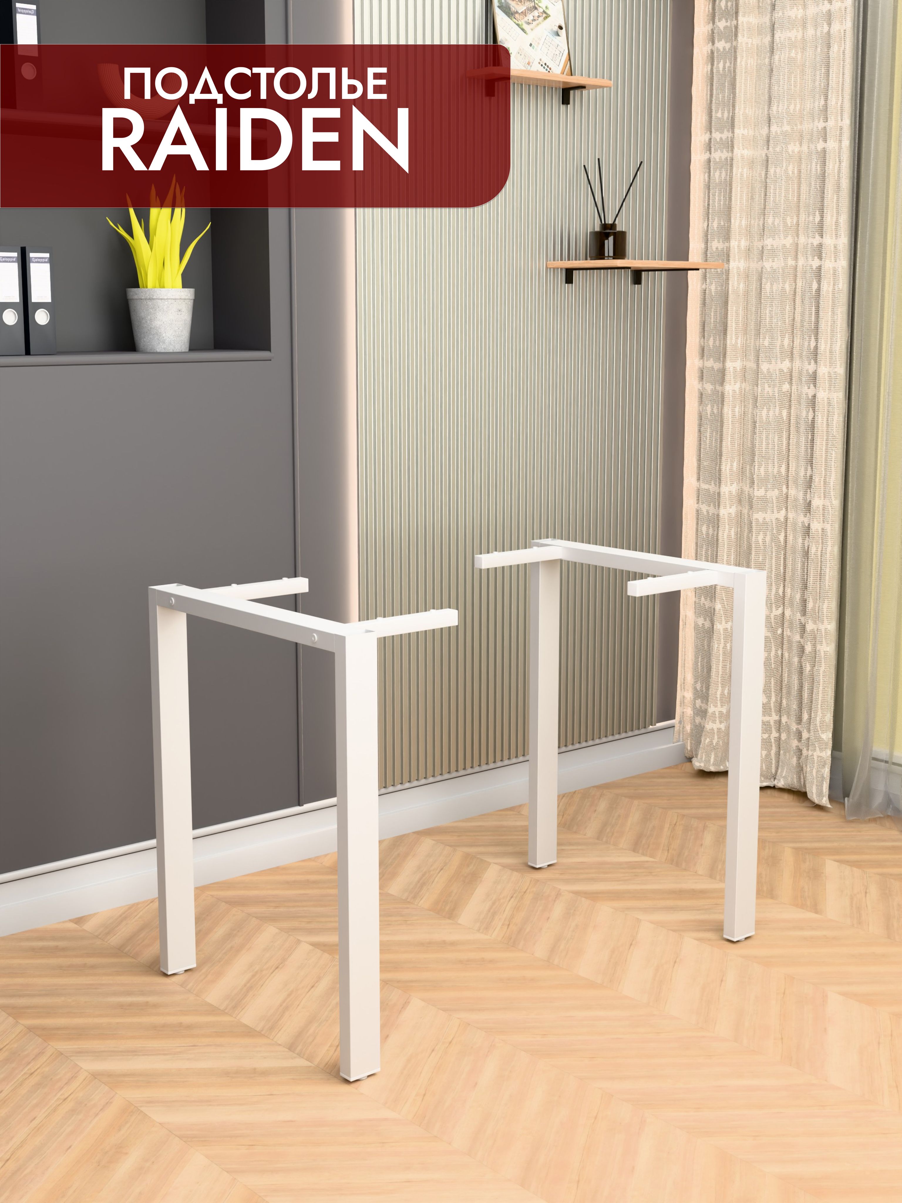 Подстолье RAIDEN с выразительной геометрией каркаса под столешницу дома или в офисе. Материал — стальная профильная труба 60×30 мм, покрытие — порошковая краска в белом или чёрном муаре. Параметры: высота 74 см, глубина 60 или 70 см. Регулируемые опоры (ход 1,5 см), сборно-разборная схема. От производителя.