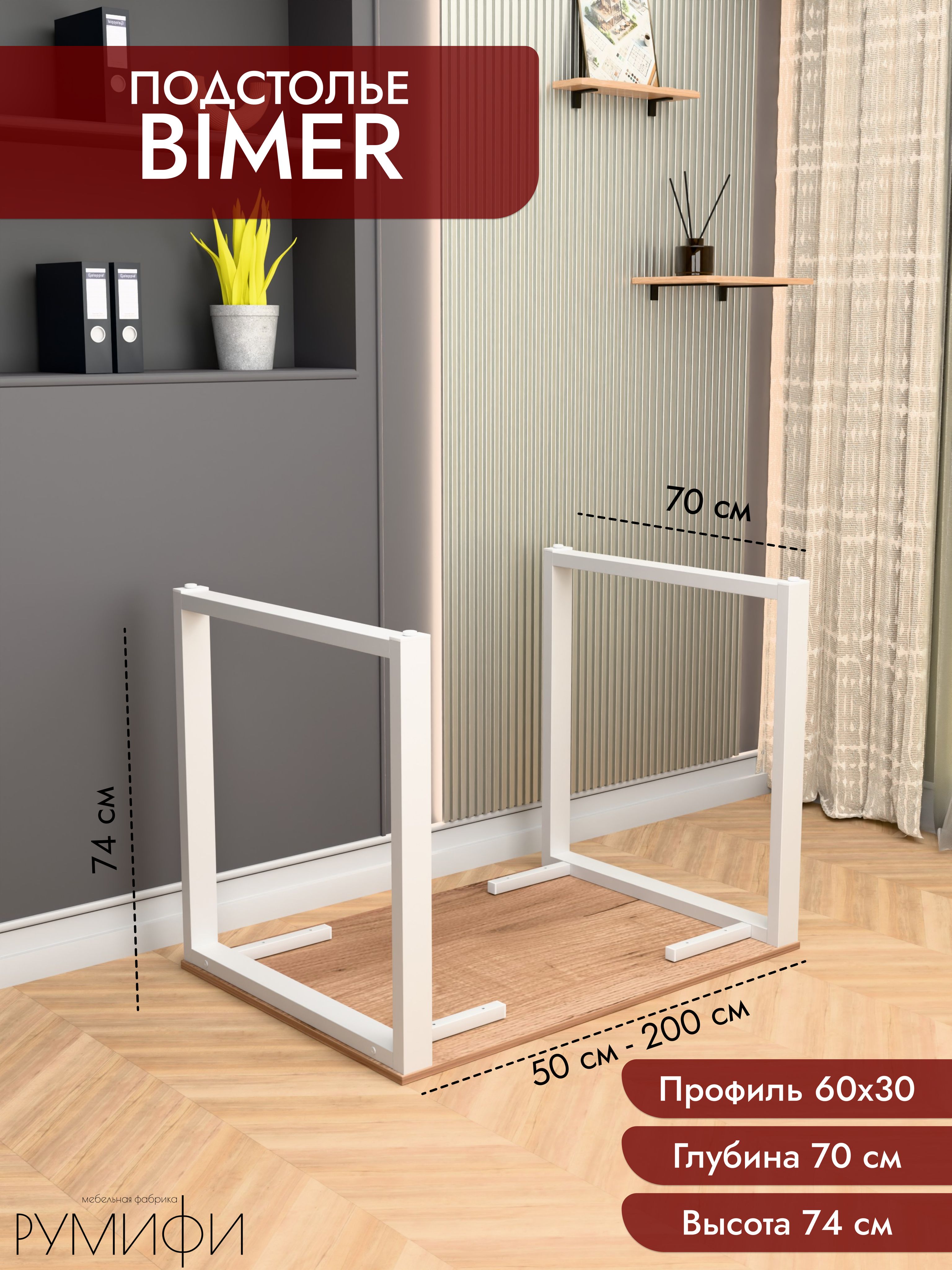 Подстолье BIMER — надёжная опора для письменного, обеденного или рабочего стола. Профиль 60×30 мм, финиш — порошковое напыление (белый / чёрный муар). Высота 74 см, глубина 60 или 70 см. Регулируемые опоры, ход 1,5 см. Конструкция разборная, поставка напрямую от производителя.