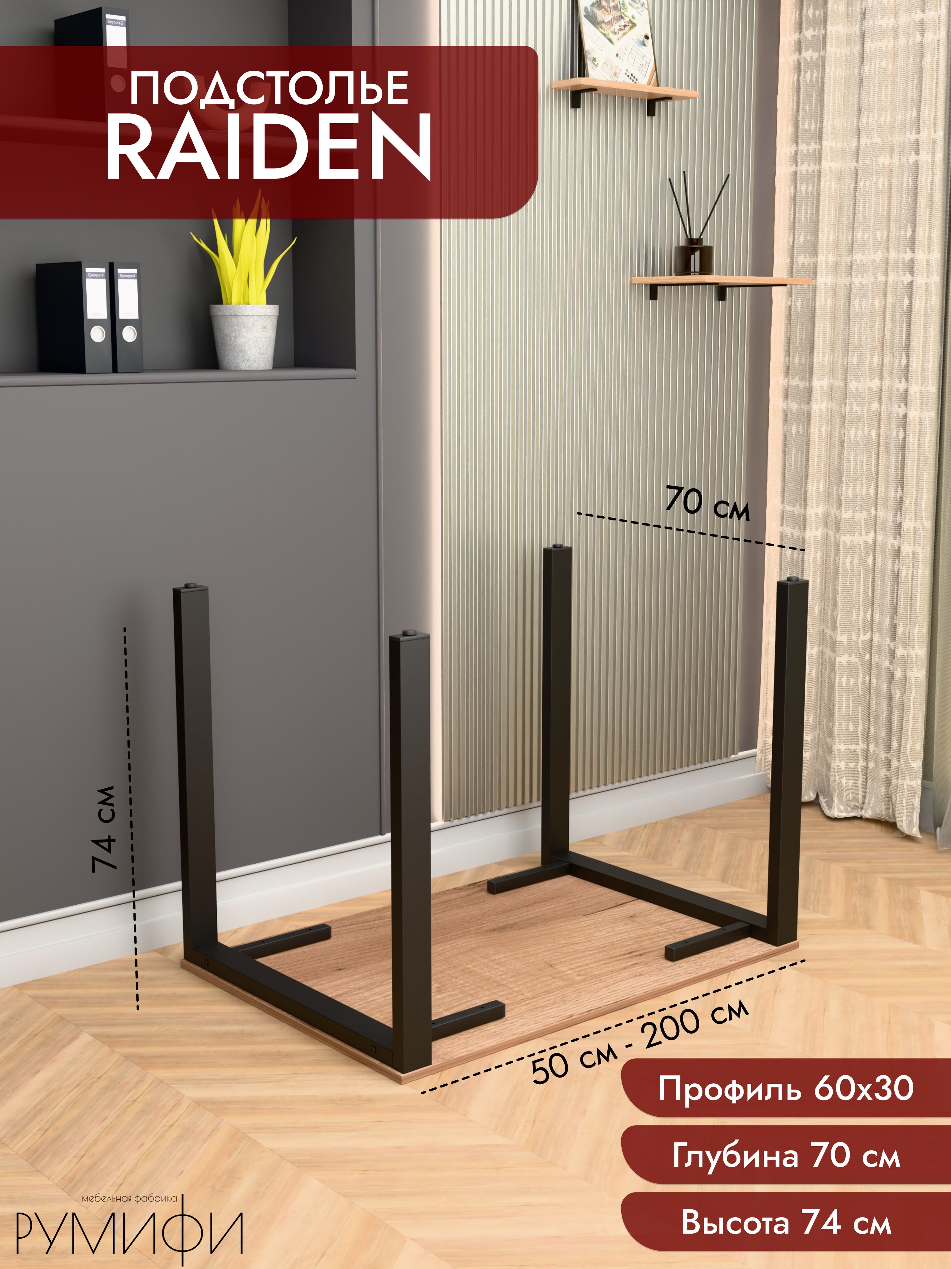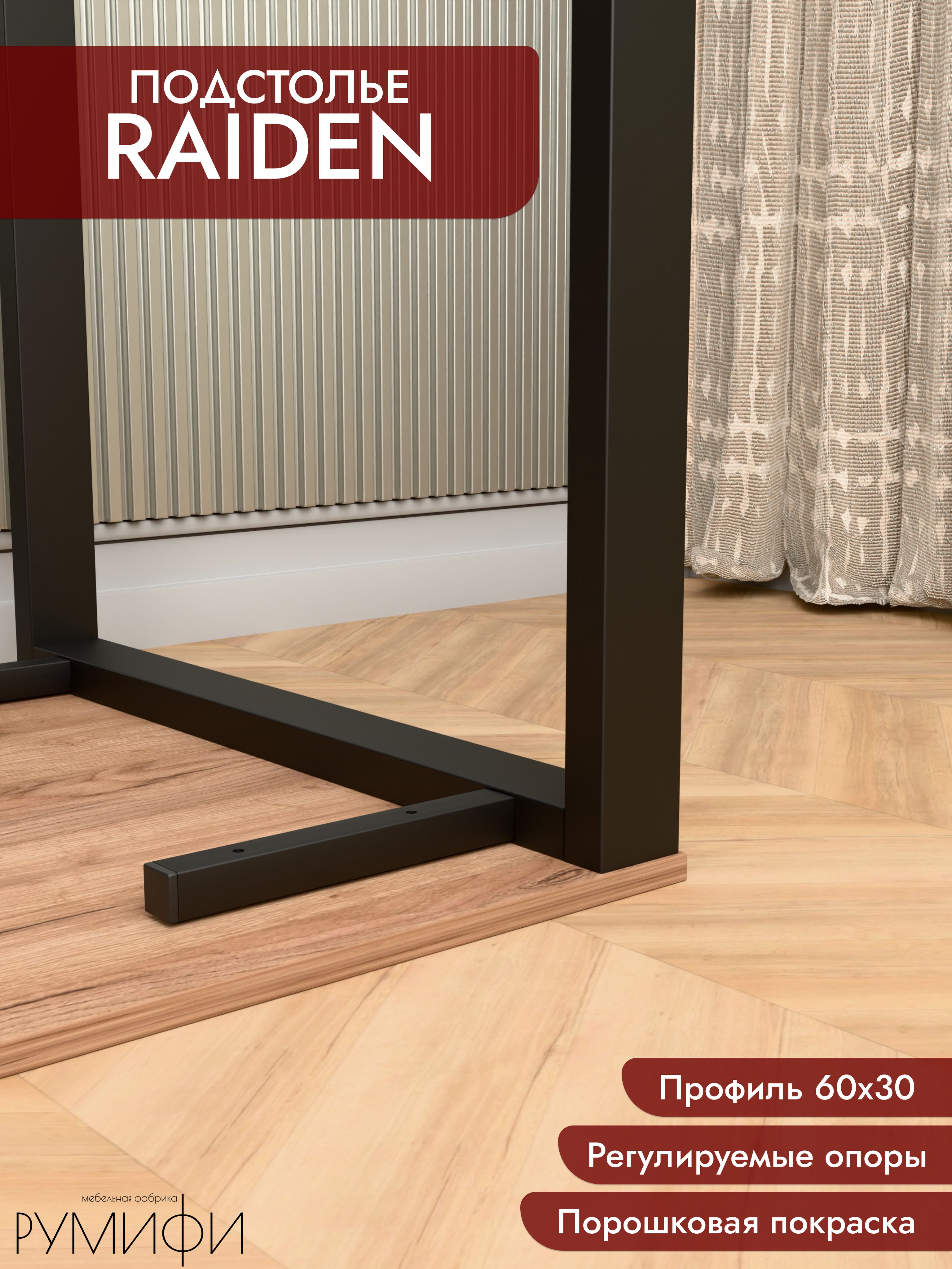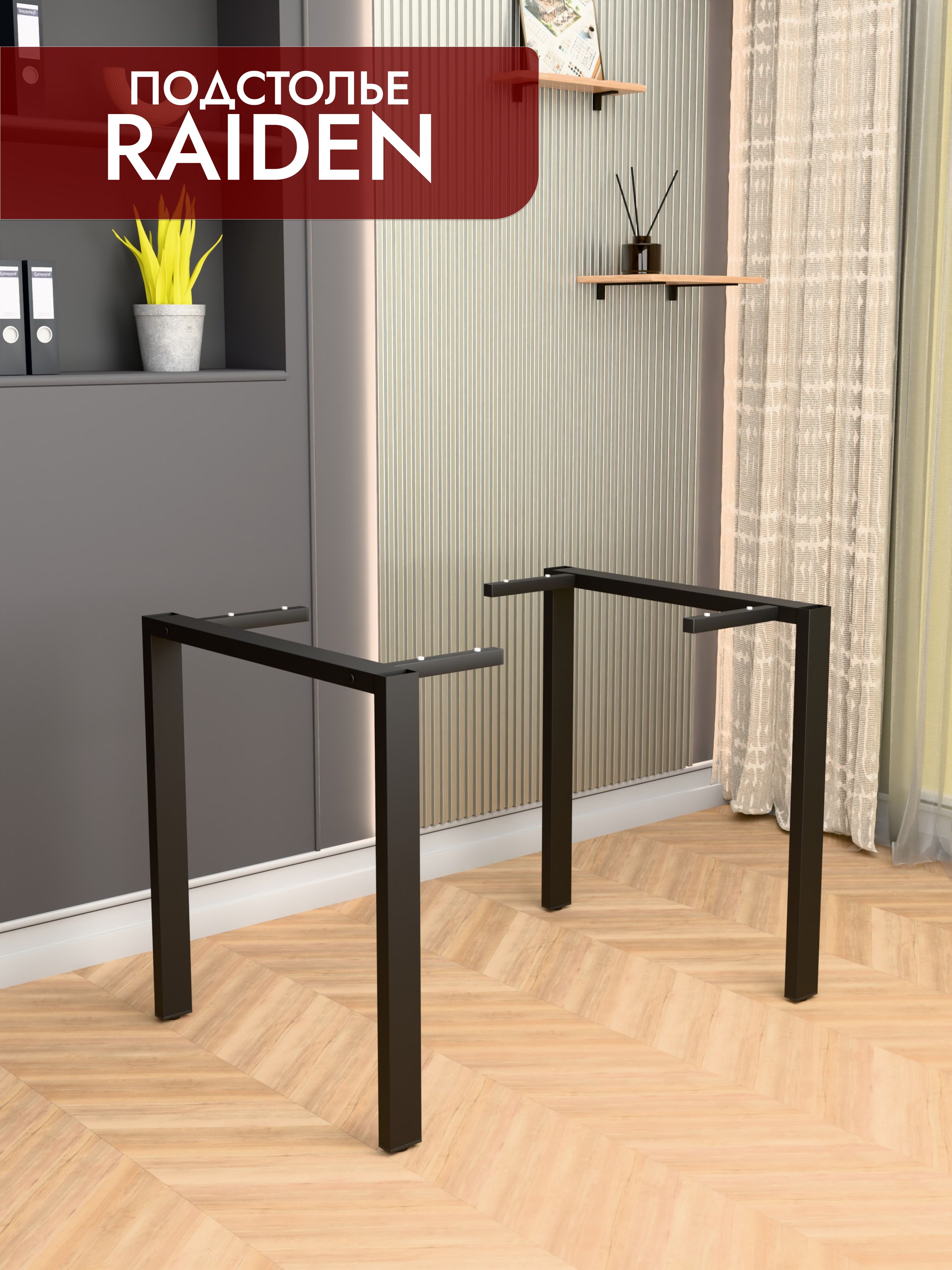 Подстолье RAIDEN с выразительной геометрией каркаса под столешницу дома или в офисе. Материал — стальная профильная труба 60×30 мм, покрытие — порошковая краска в белом или чёрном муаре. Параметры: высота 74 см, глубина 60 или 70 см. Регулируемые опоры (ход 1,5 см), сборно-разборная схема. От производителя.