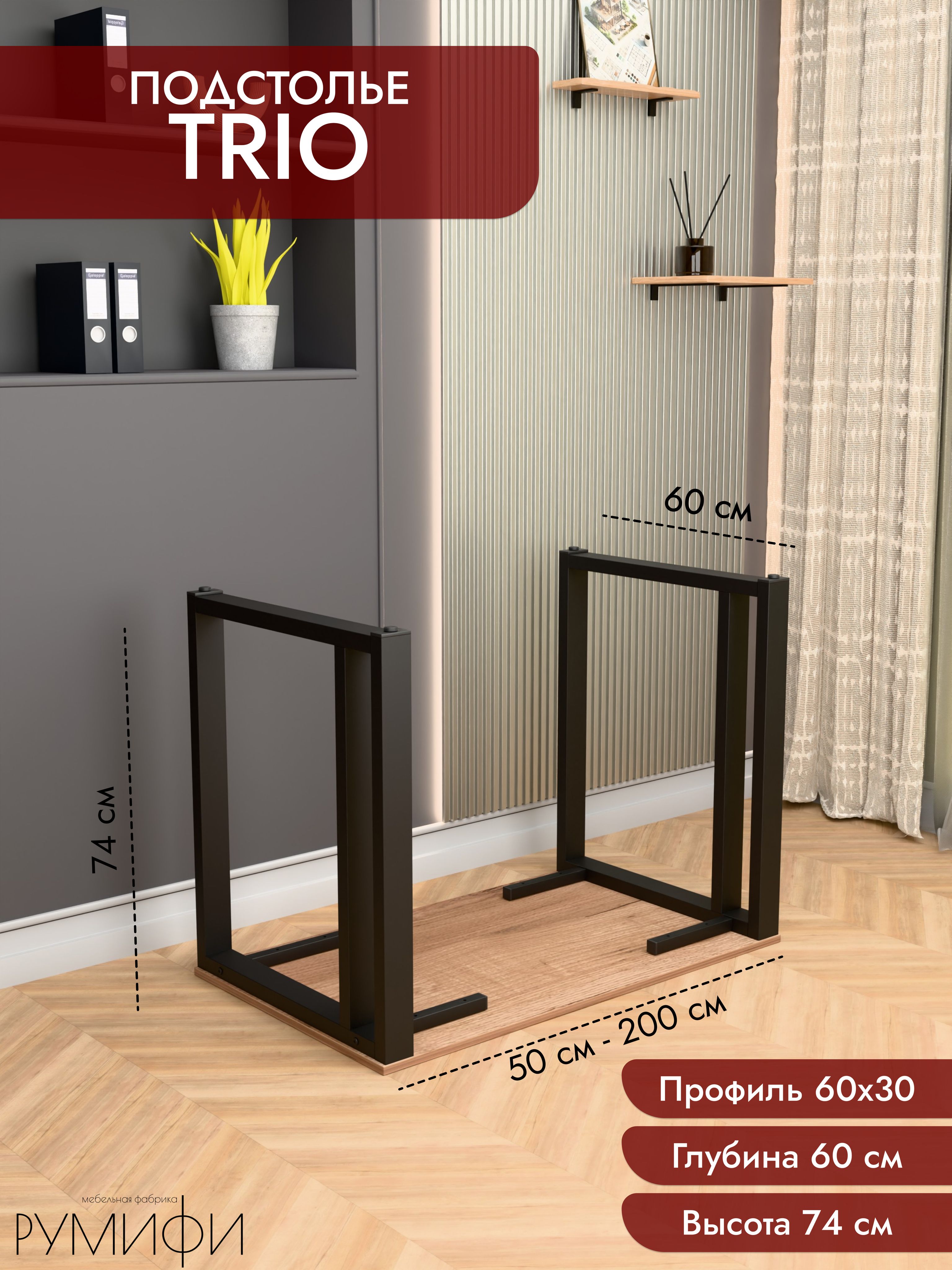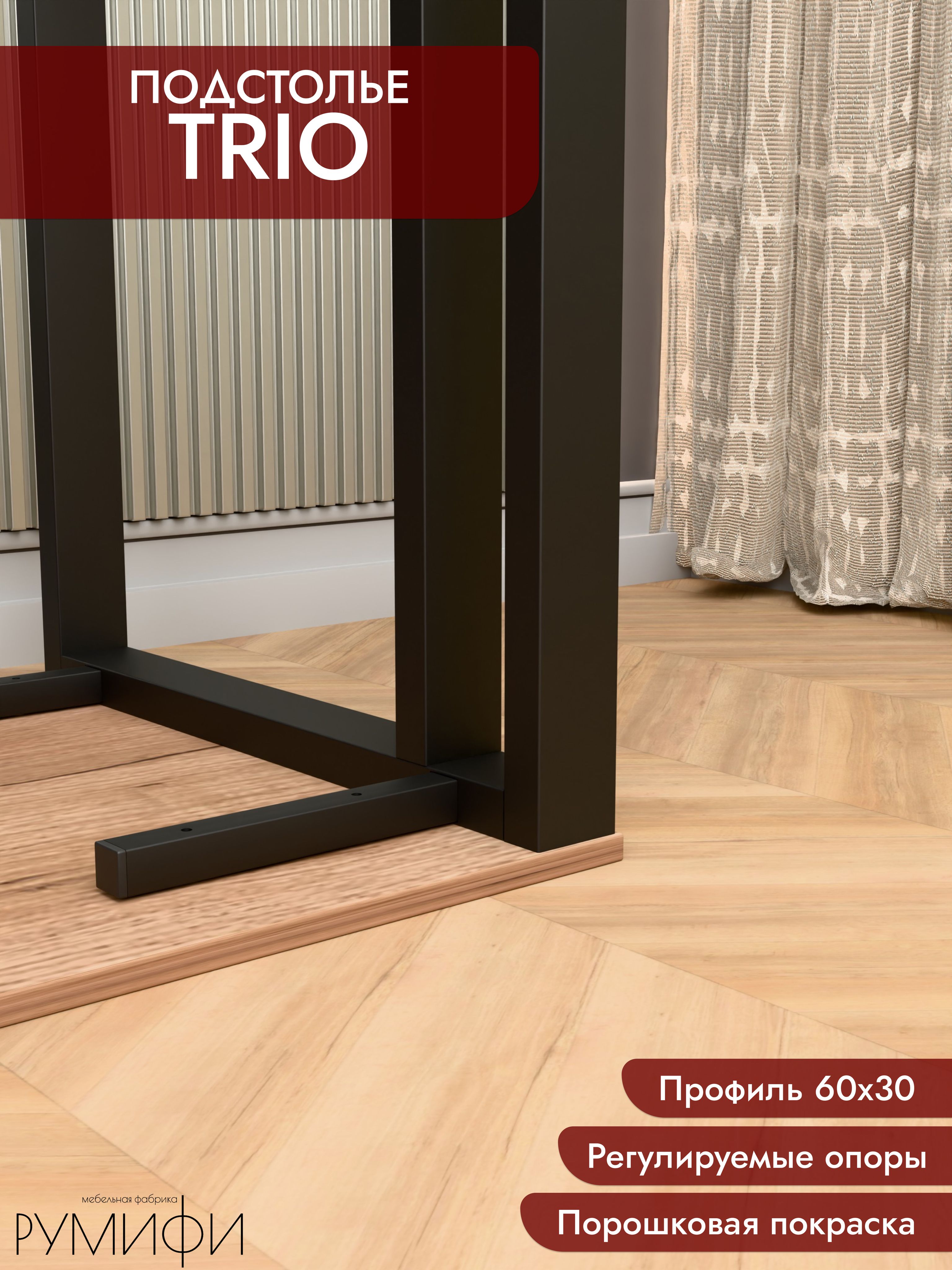 Подстолье TRIO — стальной каркас под столешницу с акцентом на устойчивость и чистые линии. Профиль 60×30 мм, отделка — порошковое покрытие (белый / чёрный муар). Фиксированная высота каркаса 74 см, глубина 60 или 70 см. Регулируемые опоры, ход 1,5 см. Сборно-разборная конструкция, от производителя.