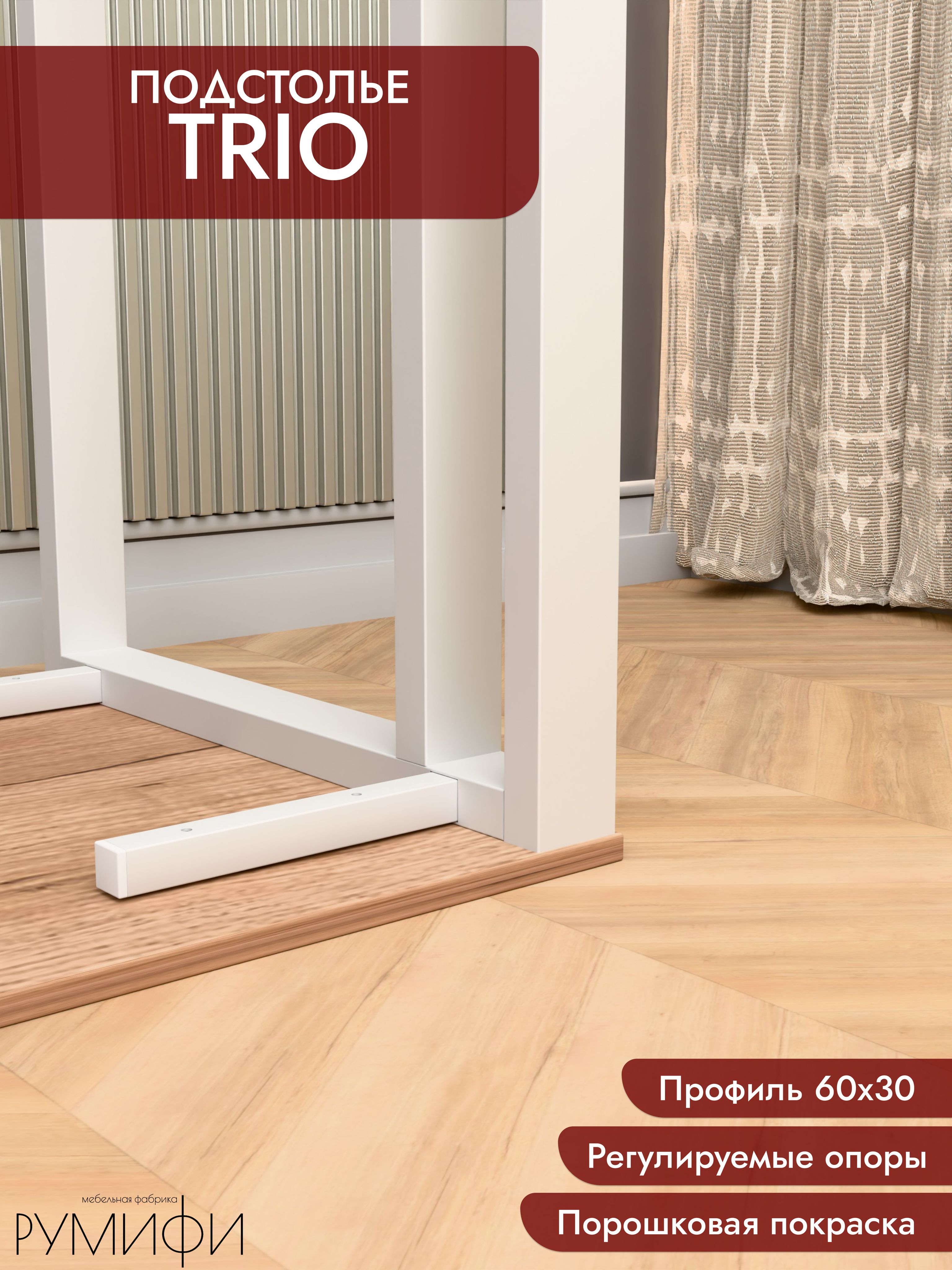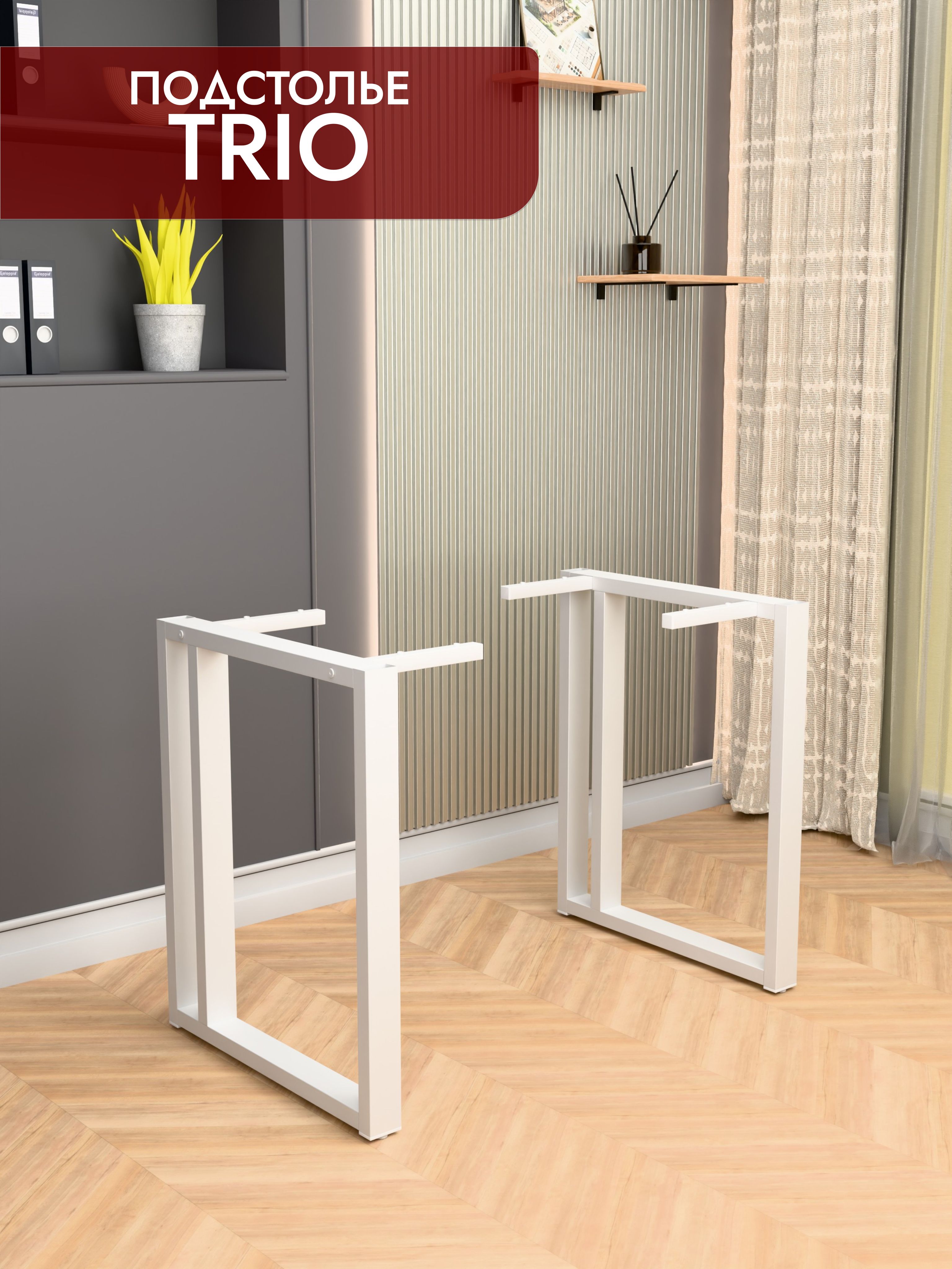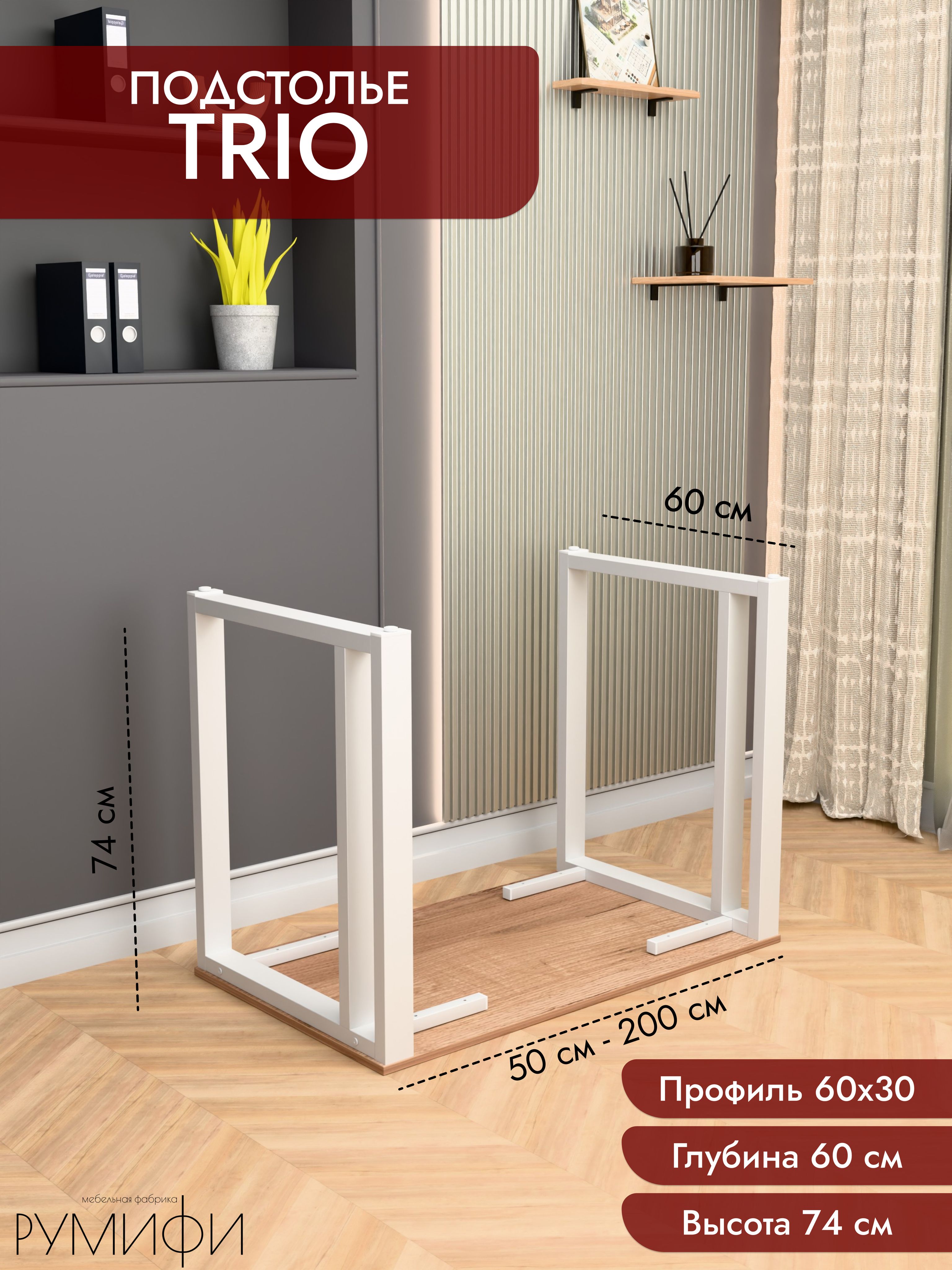 Подстолье TRIO — стальной каркас под столешницу с акцентом на устойчивость и чистые линии. Профиль 60×30 мм, отделка — порошковое покрытие (белый / чёрный муар). Фиксированная высота каркаса 74 см, глубина 60 или 70 см. Регулируемые опоры, ход 1,5 см. Сборно-разборная конструкция, от производителя.