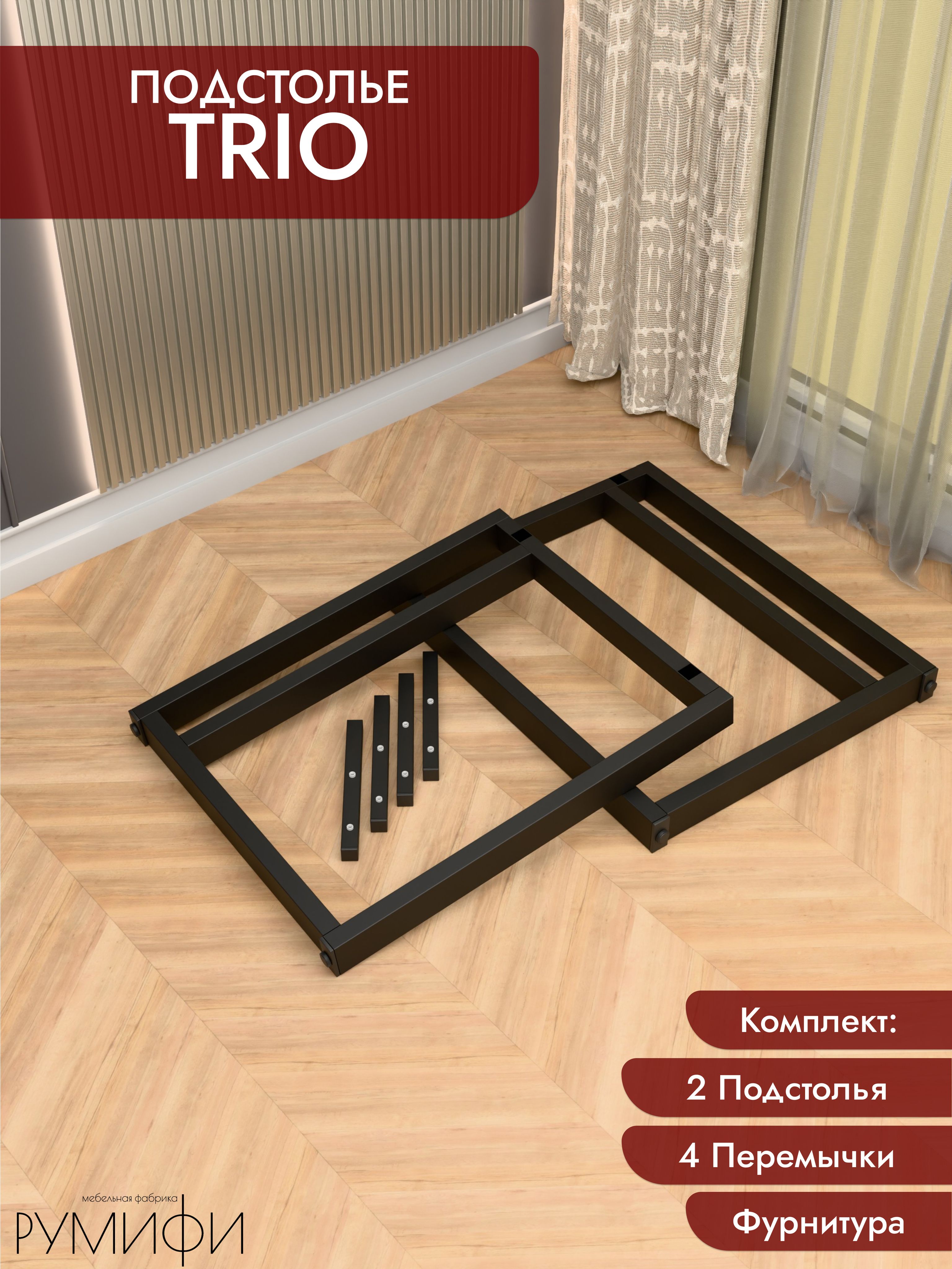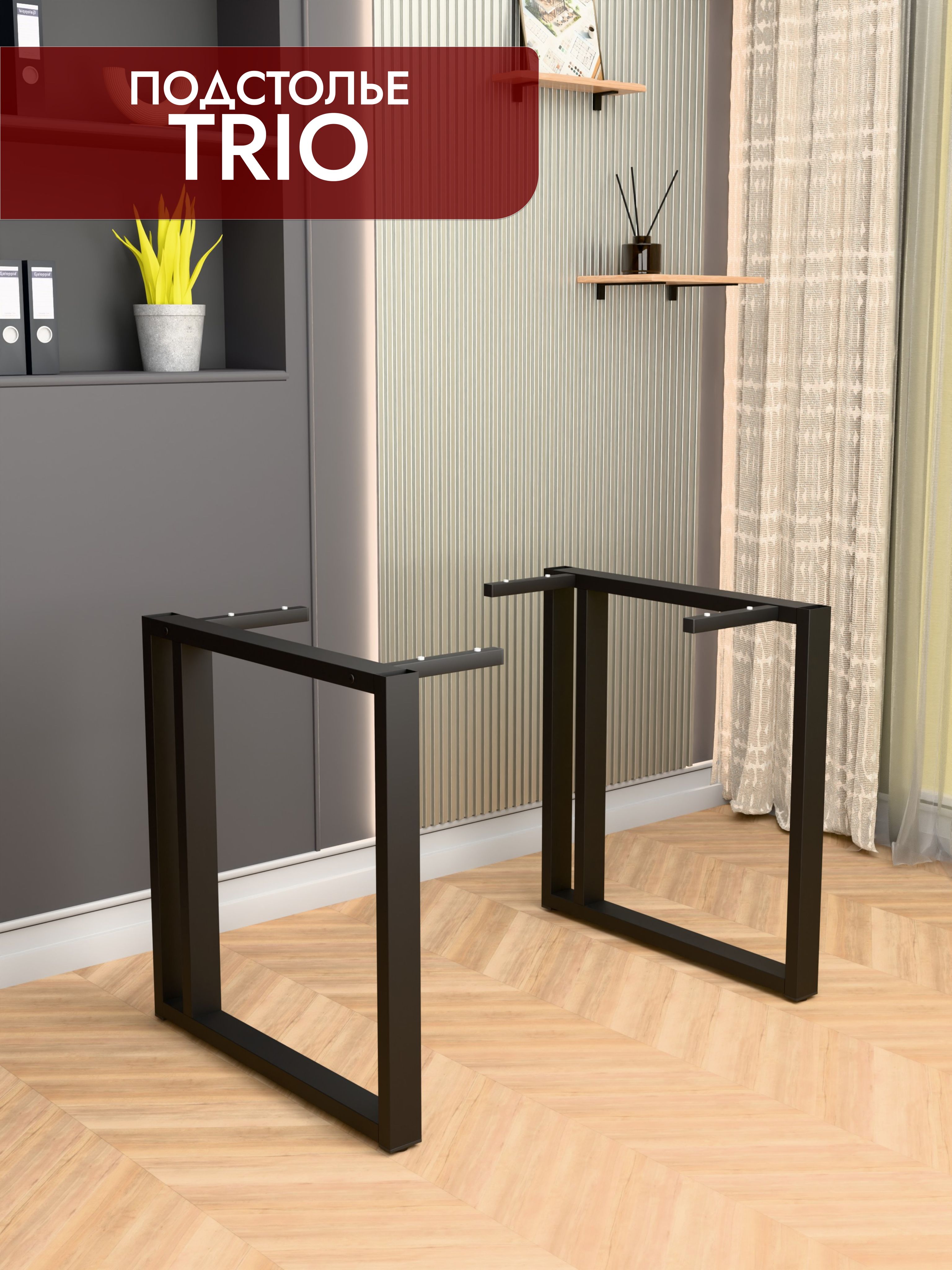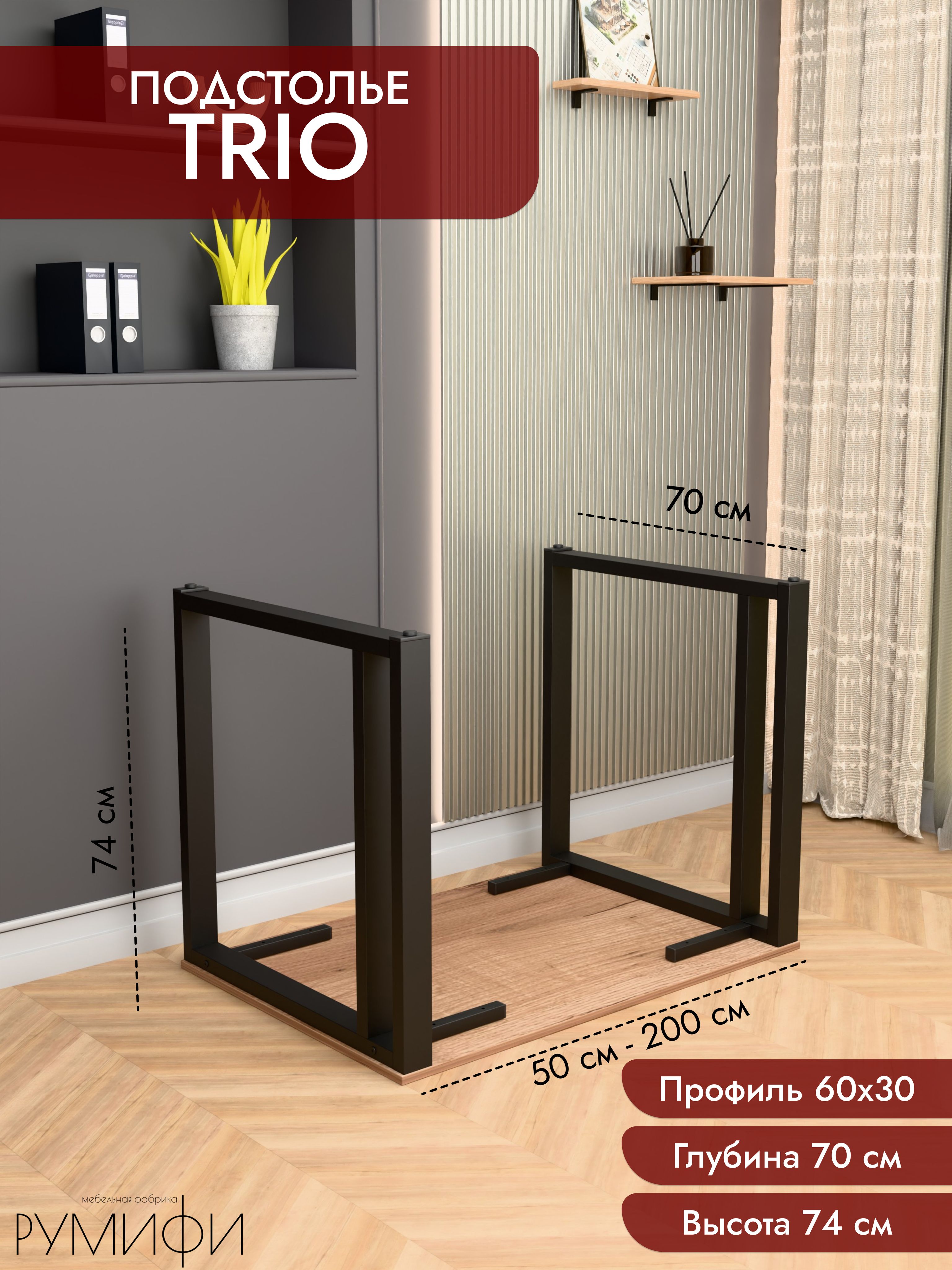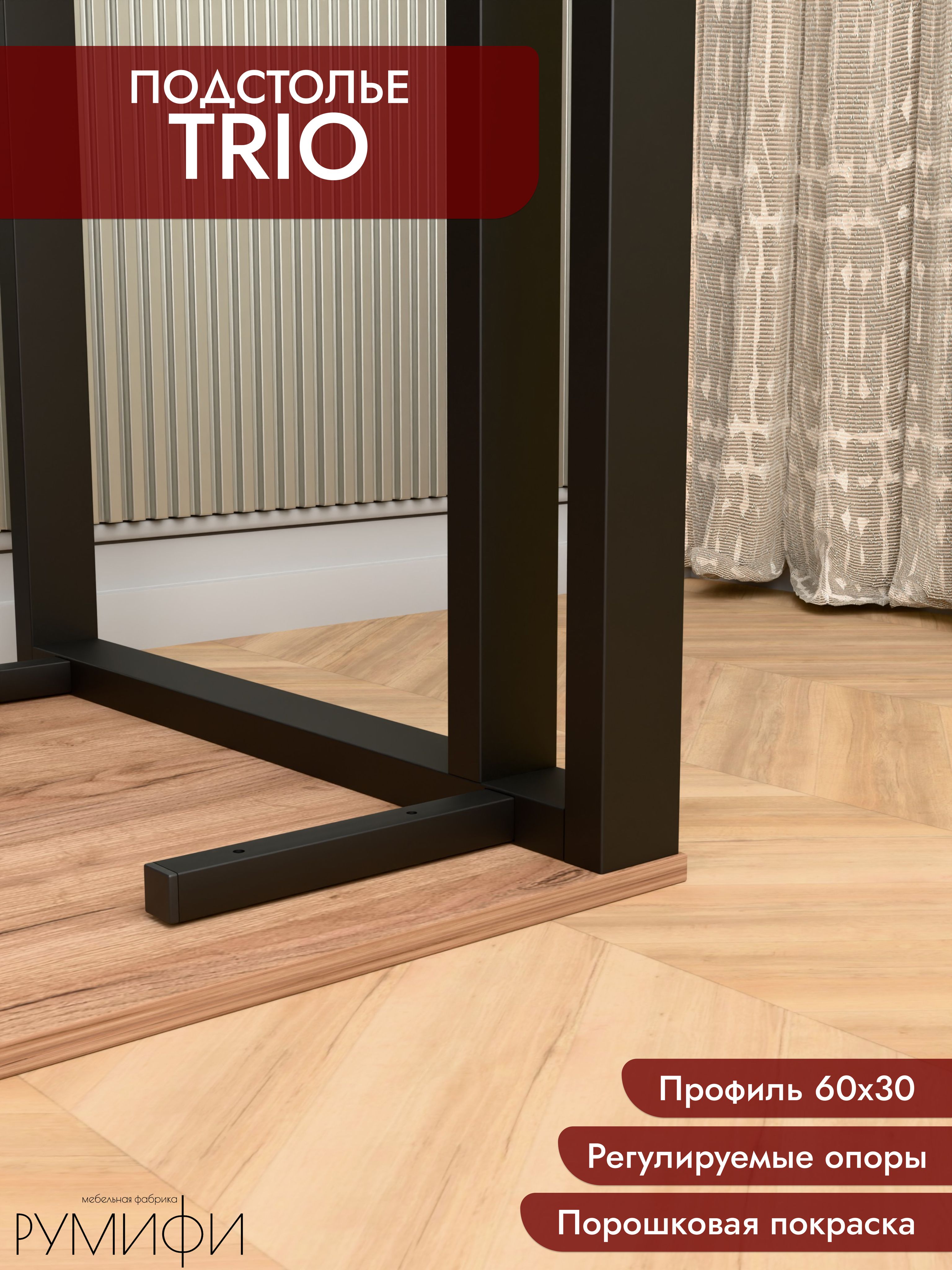 Подстолье TRIO — стальной каркас под столешницу с акцентом на устойчивость и чистые линии. Профиль 60×30 мм, отделка — порошковое покрытие (белый / чёрный муар). Фиксированная высота каркаса 74 см, глубина 60 или 70 см. Регулируемые опоры, ход 1,5 см. Сборно-разборная конструкция, от производителя.